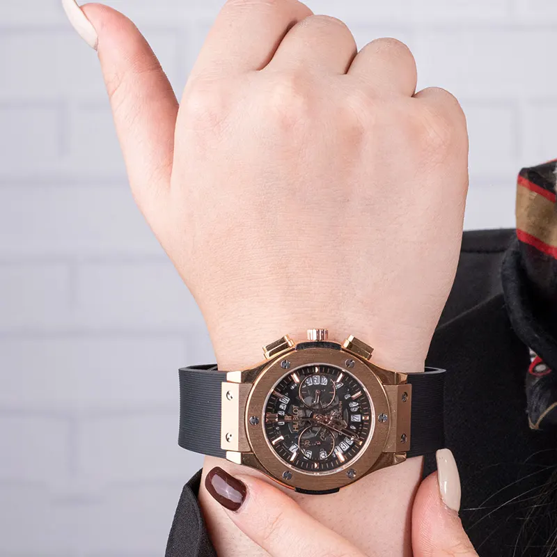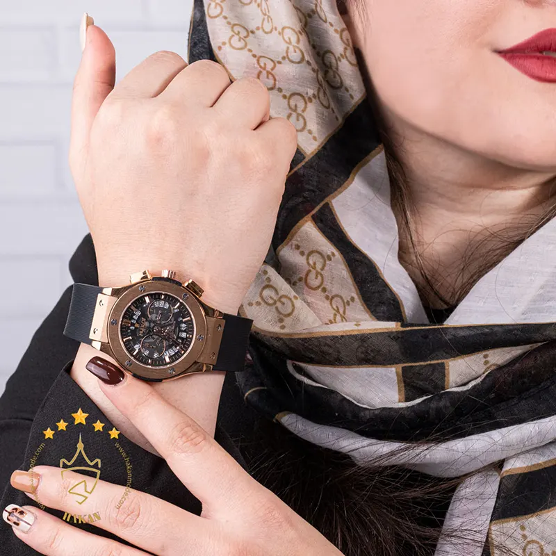 معرفی ساعت هابلوت زنانه مشکی رزگلد صفحه اسکلتون سه موتوره Hublot