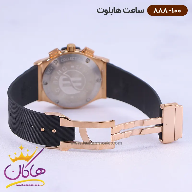 ساعت هابلوت مردانه بند رابر کرنوگراف صفحه سفید قاب رزگلد 888/100 نمای باز قفل