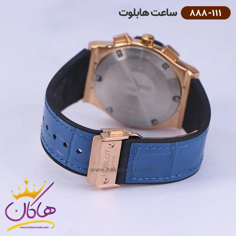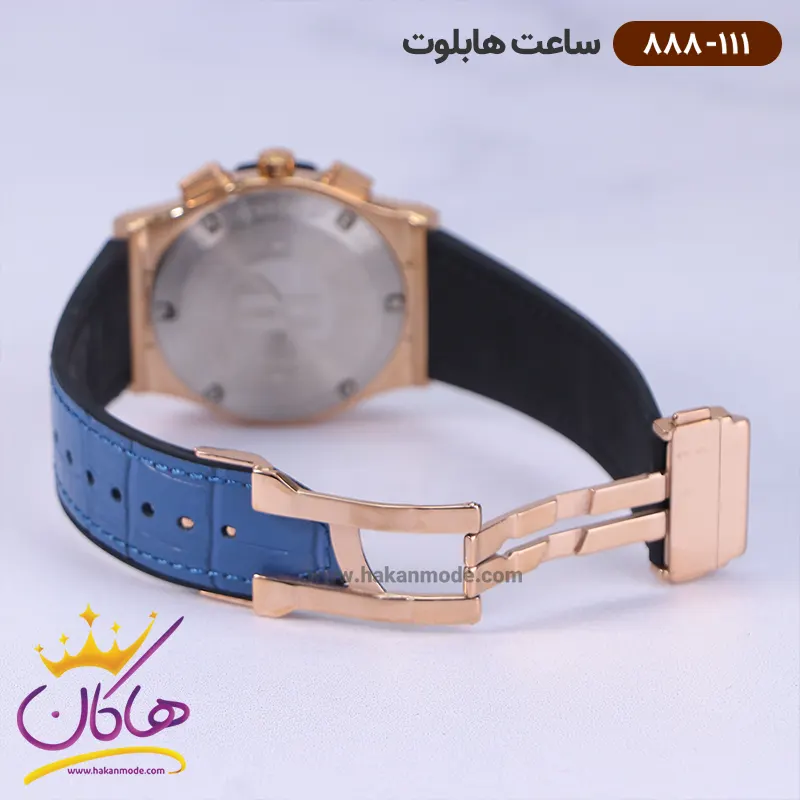 ساعت هابلوت مردانه بند چرم آبی قاب رزگلد کرنوگراف 888/111 نمای باز قفل