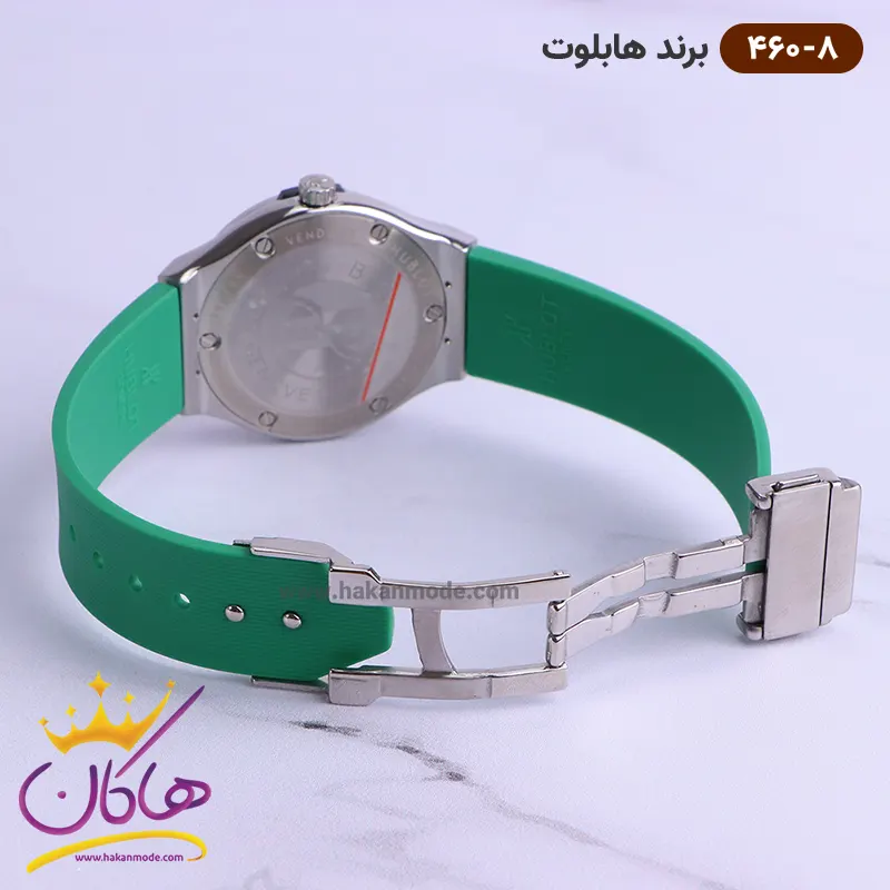 ساعت هابلوت زنانه کرنوگراف بند رابر قاب تمام نگین صفحه سبز نمای روی دست مدل