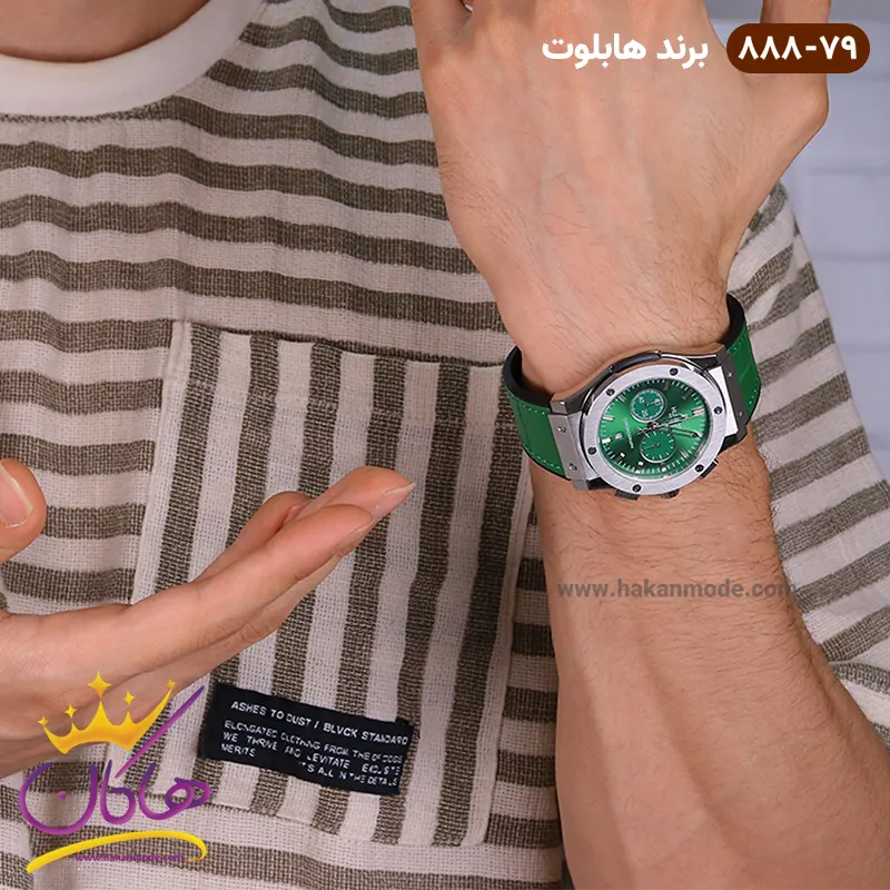 ساعت هابلوت مردانه کرنوگراف قاب نقره ای صفحه سبز نمای روی دست از دور