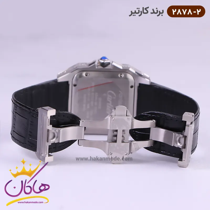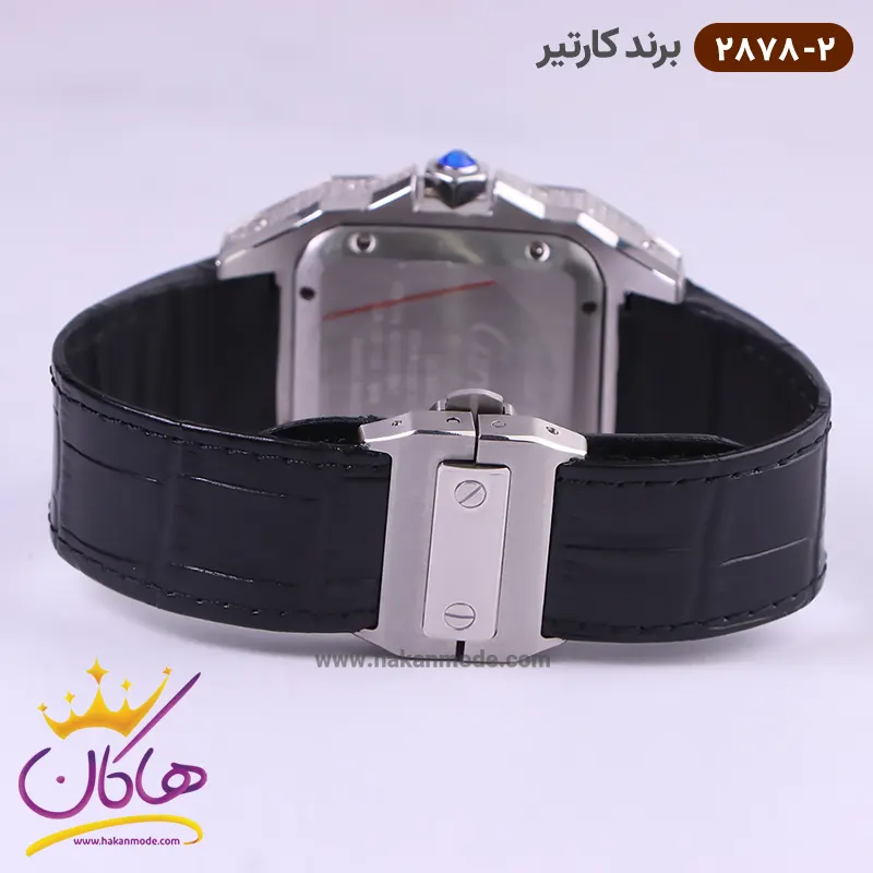 ساعت کارتیر مردانه بند چرمی 2878/2 ظاهری کلاسیک و جذاب دارد. قاب تمام نگین این ساعت استیل نقرهای، رنگ ثابت و ضدحساسیت است. اصلیترین چیزی که در ساعت کارتیر مردانه توجه ما را به خود جلب میکند قاب مربع شکل ساعت است. صفحهی این ساعت سفید بوده و اندکسهای آن به صورت لاتین و مشکی طراحی شدهاند. عقربههای این ساعت شبنما هستند. نام برند cartier زیر ساعت 12 دیده میشود. در کنار صفحه یک پیچ کوک برای تنظیم زمان وجود دارد. بند ساعت از نوع چرم مرغوب که پوسته پوسته و بریده نمیشود. این بند باعث تعرق و خارش نمیشود و قفل آن از مدل پروانهای دکمهدار است که از دسته قفلهای محکم و مطمئن است.