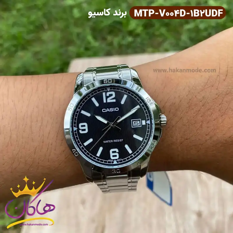 ساعت کاسیو مردانه فلزی نقره ای MTP-V004D-1B2UDF ظاهری کلاسیک و جذاب دارد. این ساعت استیل نقره ای، رنگ ثابت و ضدحساسیت است. اصلیترین چیزی که در ساعت کاسیو مردانه توجه ما را به خود جلب میکند همخوانی رنگ بند با قاب نقره ای ساعت است. صفحهی این ساعت مشکی بوده و اندکسهای آن ترکیبی، خطی و عددی طراحی شدهاند. یک مربع کوچک در کنار ساعت 3 وجود دارد که همان تقویم ساعت است. نام برند casio زیر ساعت 12 دیده میشود. در کنار صفحه یک پیچ کوک برای تنظیم زمان وجود دارد. بند ساعت، از یک بافت ریز و درشت تشکیل شده است. همچنین جنس بند فلزی و از نوع استیل مرغوب است که باعث تعرق و خارش نمیشود. قفل آن از مدل دو تکه است که از دسته قفلهای محکم و مطمئن است.
