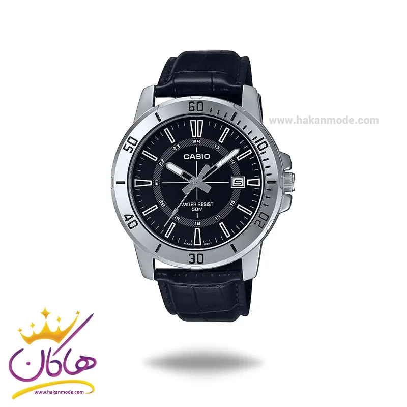 ساعت کاسیو مردانه چرم مشکی قاب نقره ای MTP-VD01L-1C