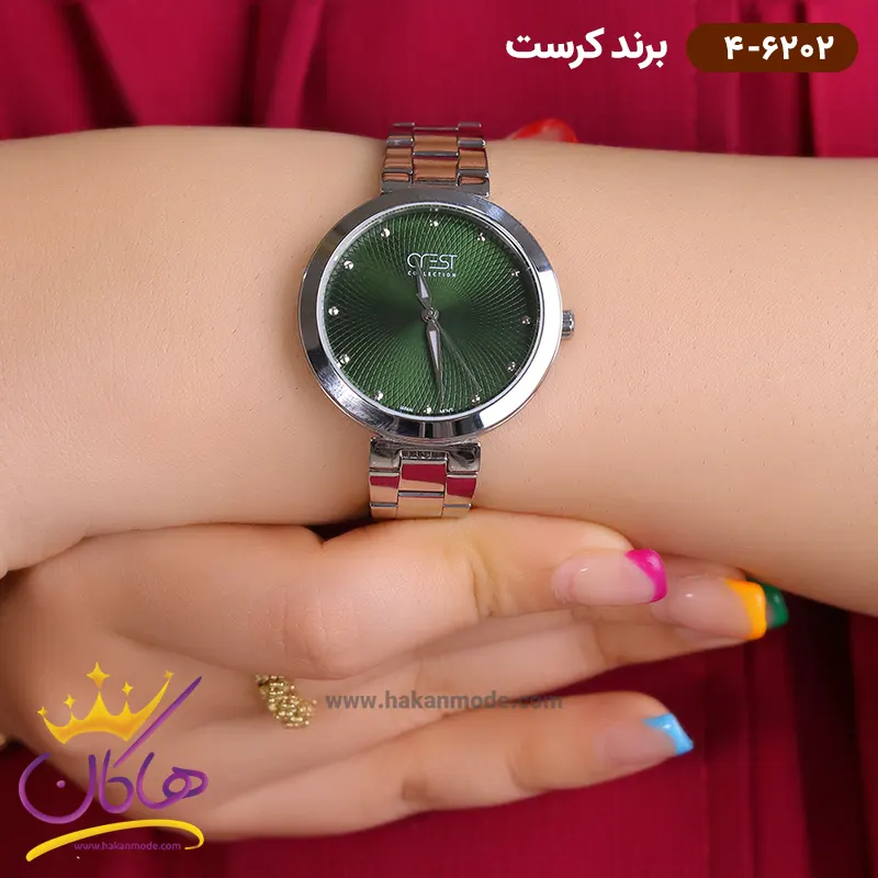 ساعت کرست زنانه فلزی 6202/4 ظاهری کلاسیک و جذاب دارد. این ساعت استیل نقرهای، رنگ ثابت و ضدحساسیت است. اصلیترین چیزی که در ساعت عقربهای زنانه کرست توجه ما را به خود جلب میکند، صفحهی سبز و طرحدار آن است. عقربههای این ساعت، مدل الفا و شبنما هستند که به شما این امکان را میدهد که در شب و محیطهای کم نور هم گذر زمان را ببینید. اگر به درون صفحه نگاه کنید، متوجه میشوید که اندکسهای این ساعت به شکل نگینهای دایرهای طراحی شدهاند. نام برند crest زیر ساعت 12 دیده میشود. در کنار صفحه یک پیچ کوک برای تنظیم زمان وجود دارد. بند ساعت، فلزی و از نوع استیل مرغوب است که باعث تعرق و خارش نمیشود. طرح این بند از یک بافت ریز و درشت تشکیل شده است و قفل آن از مدل سهتکه دکمهدار است که از دسته قفلهای محکم و مطمئن است.