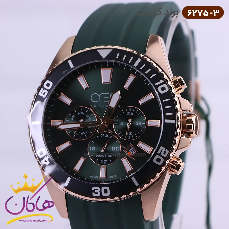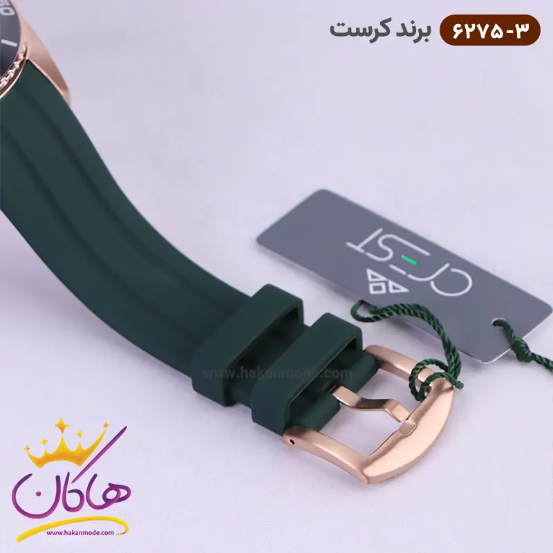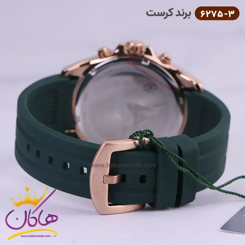 ساعت کرست مردانه بند رابر کد 6275/3 ظاهری مدرن و جذاب دارد. قاب این ساعت استیل رزگلد، رنگ ثابت و ضدحساسیت است. اگر به داخل ساعت نگاه کنید، صفحهی این ساعت به رنگ سبز است و سه صفحه دایرهای کوچک میبینید که هر کدام از آنها نشان دهندهی پارامتری خاص هستند. یک صفحه که در سمت چپ قرار دارد روزهای هفته را نشان میدهد. صفحهی سمت راست ساعت را به صورت 24 ساعته نشان میدهد. اگر از افرادی هستید که امور خود را بر اساس تایم 24 ساعته تنظیم میکنید این صفحه کوچک به کار شما میآید. یک صفحه که وسط قرار دارد dual time یا دو زمانه است. ساعت دو زمانه ساعتی است که به طور هم زمان میتواند دو زمان مختلف مربوط به دو منطقه متفاوت را نمایش دهد. به صورتی که میتوانید با داشتن این ساعت زمان دو کشور متفاوت را در یک صفحه داشته باشید. یک مربع کوچک بین عدد ۴ و ۵ قرار دارد که همان تقویم ساعت است. بند ساعت رابر سبز رنگ، مرغوب و ضد حساسیت است. این بند باعث تعرق و خارش نمیشود و قفل آن از مدل کمربندی (سگکی) است که از دسته قفلهای محکم و مطمئن بشمار میرود. اندکسهای این ساعت به صورت خطی رزگلد و عقربههای آن شبنما طراحی شدهاند. لوگوی برند کرست را زیر عدد 12 میبینید. در کنار صفحه یک پیچ کوک و دو دکمه برای تنظیم زمان وجود دارد.