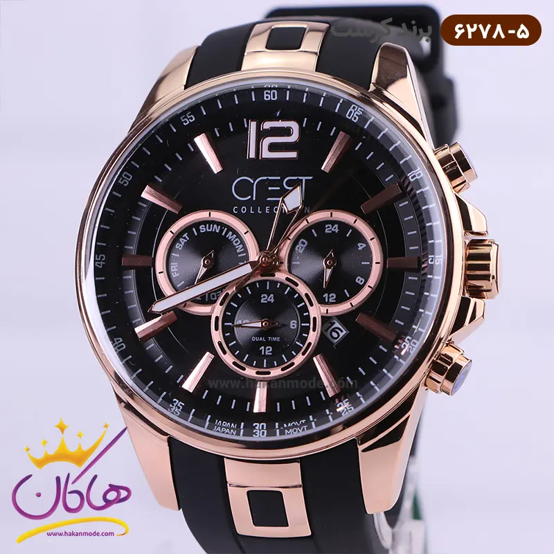 ساعت کرست مردانه بند رابر کد 6278/5 ظاهری مدرن و جذاب دارد. قاب این ساعت استیل رزگلد، رنگ ثابت و ضدحساسیت است. اگر به داخل ساعت نگاه کنید، صفحهی این ساعت به رنگ مشکی است و سه صفحه دایرهای کوچک میبینید که هر کدام از آنها نشان دهندهی پارامتری خاص هستند. یک صفحه که در سمت چپ قرار دارد روزهای هفته را نشان میدهد. صفحهی سمت راست ساعت را به صورت 24 ساعته نشان میدهد. اگر از افرادی هستید که امور خود را بر اساس تایم 24 ساعته تنظیم میکنید این صفحه کوچک به کار شما میآید. یک صفحه که وسط قرار دارد dual time یا دو زمانه است. ساعت دو زمانه ساعتی است که به طور هم زمان میتواند دو زمان مختلف مربوط به دو منطقه متفاوت را نمایش دهد. به صورتی که میتوانید با داشتن این ساعت زمان دو کشور متفاوت را در یک صفحه داشته باشید. یک مربع کوچک بین عدد ۴ و ۵ قرار دارد که همان تقویم ساعت است. بند ساعت رابر مشکی رنگ، مرغوب و ضد حساسیت است. این بند باعث تعرق و خارش نمیشود و قفل آن از مدل کمربندی (سگکی) است که از دسته قفلهای محکم و مطمئن بشمار میرود. اندکسهای این ساعت به صورت خطی رزگلد و عقربههای آن شبنما طراحی شدهاند. فقط اندکس موقعیت ساعت ۱۲ به صورت عددی است. لوگوی برند کرست را زیر عدد 12 میبینید. در کنار صفحه یک پیچ کوک و دو دکمه برای تنظیم زمان وجود دارد.