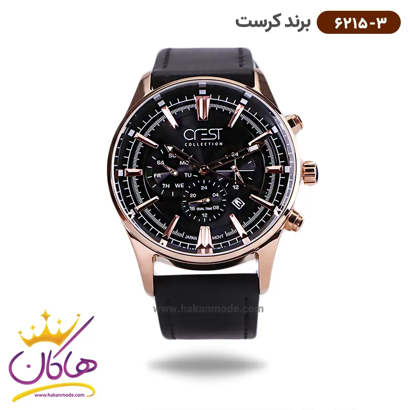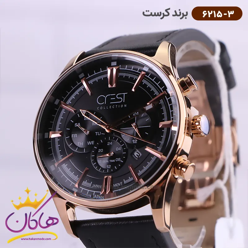 ساعت کرست مردانه بند چرمی مدل 6215/3 ظاهری مدرن و جذاب دارد. قاب این ساعت به رنگ استیل رزگلد، رنگ ثابت و ضدحساسیت است. اصلیترین چیزی که در ساعت مردانه کرست توجه ما را به خود جلب میکند، سه صفحه دایرهای کوچک است، که درون صفحه هستند. دایرههای موجود در صفحهی ساعت شما، هر کدام نشان دهندهی پارامتری خاص هستند. یک صفحه ساعت را به صورت ۲۴ ساعت نشان می دهد. گزینه بعدی روزهای هفته را نشان میدهد. دایرهی بعدی نشان دهندهی ساعت جهانی است. یک مربع کوچک بین اعداد ۴ و ۵ قرار دارد که همان تقویم ساعت است. عقربهها، مدادی و شبنما و اندکسها خطی رزگلد هستند. اگر به درون صفحه مشکی این ساعت نگاه کنید، نام برند crest زیر ساعت 12 دیده میشود. در کنار صفحه یک پیچ کوک برای تنظیم زمان وجود دارد. بند ساعت از نوع چرم مرغوب که پوسته پوسته و بریده نمیشود. این بند باعث تعرق و خارش نمیشود و قفل آن از مدل سهتکه دکمهدار است که از دسته قفلهای محکم و مطمئن است.