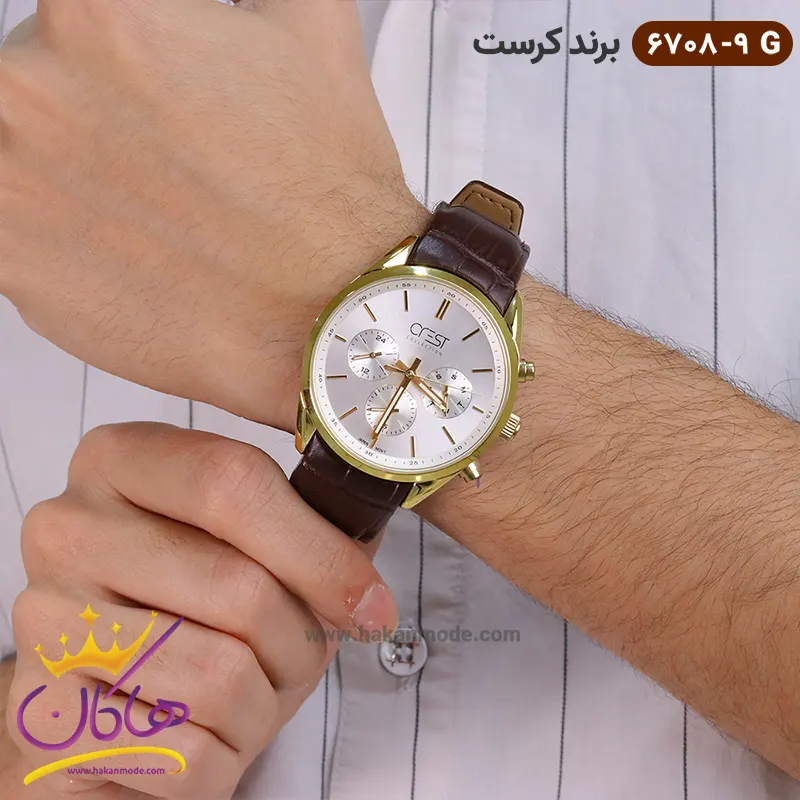 ساعت کرست مردانه بند چرمی مدل 6708/9 ظاهری کلاسیک و جذاب دارد. قاب این ساعت به رنگ استیل طلایی، رنگ ثابت و ضدحساسیت است. اصلیترین چیزی که در ساعت مردانه کرست توجه ما را به خود جلب میکند، سه صفحه دایرهای کوچک است، که درون صفحه هستند. دایرههای موجود در صفحهی ساعت شما، هر کدام نشان دهندهی پارامتری خاص هستند. یک صفحه ساعت را به صورت ۲۴ ساعت نشان می دهد. گزینه بعدی روزهای هفته را نشان میدهد. دایرهی بعدی نشان دهندهی عدد روزهای ماه است. عقربهها، مدادی و اندکسها خطی طلایی رنگ هستند. اگر به درون صفحه نگاه کنید، نام برند crest زیر ساعت 12 دیده میشود. در کنار صفحه سه پین کوک برای تنظیم زمان وجود دارد. بند ساعت از نوع چرم مرغوب که پوسته پوسته و بریده نمیشود. این بند باعث تعرق و خارش نمیشود و قفل آن از مدل پروانهای است که از دسته قفلهای محکم و مطمئن است.