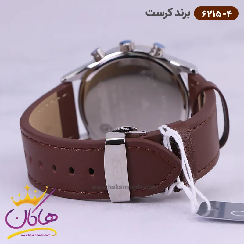 ساعت کرست مردانه بند چرمی قهوه ای دو زمانه کد 6215/4 ظاهری مدرن و جذاب دارد. قاب این ساعت به رنگ استیل طلایی، رنگ ثابت و ضدحساسیت است. اصلی‌ترین چیزی که در ساعت مردانه کرست توجه ما را به خود جلب می‌کند، سه صفحه دایره‌ای کوچک است، که درون صفحه‌ی نقره‌ای رنگ ساعت وجود دارد. دایره‌های موجود در صفحه‌ی ساعت شما، هر کدام نشان دهنده‌ی پارامتری خاص هستند. یک صفحه ساعت را به صورت ۲۴ ساعت نشان می دهد. گزینه بعدی روزهای هفته را نشان می‌دهد. دایره‌ی بعدی نشان دهنده‌ی ساعت جهانی است. یک مربع کوچک بین اعداد ۵ و ۴ قرار دارد که همان تقویم ساعت است. عقربه‌ها، طلایی شبنما و اندکس‌ها خطی طلایی رنگ هستند. نام برند crest زیر ساعت 12 دیده می‌شود. در کنار صفحه یک پیچ کوک برای تنظیم زمان وجود دارد. بند ساعت از نوع چرم مرغوب که پوسته پوسته و بریده نمی‌شود. این بند باعث تعرق و خارش نمی‌شود و قفل آن از مدل پروانه‌ای دکمه‌دار است که از دسته قفل‌های محکم و مطمئن است.