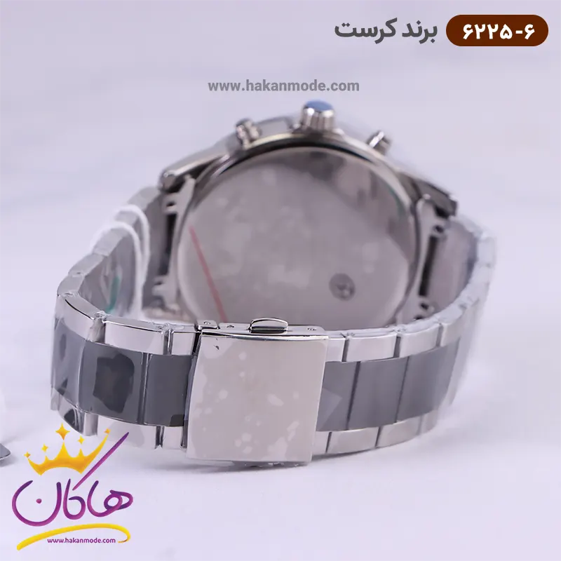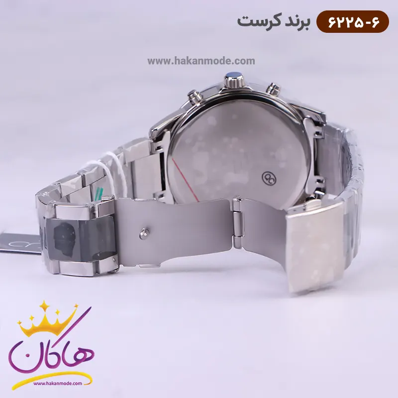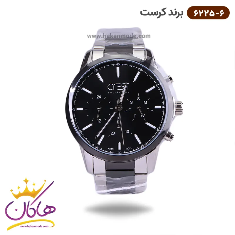 ساعت کرست مردانه فلزی مشکی نقره ای سه موتوره مدل 6225/6 ظاهری کلاسیک و جذاب دارد. این ساعت بند استیل نقره‌ای/مشکی، رنگ ثابت و ضدحساسیت است. اصلی‌ترین چیزی که در ساعت مردانه کرست توجه ما را به خود جلب می‌کند، سه صفحه کوچک است، که درون صفحه هستند. دایره‌های موجود در صفحه‌ی مشکی ساعت، هر کدام نشان دهنده‌ی پارامتری خاص هستند. صفحه‌ی سمت چپ، ساعت را به صورت ۲۴ ساعت نشان می‌دهد. صفحه‌ی سمت راست روزهای هفته را نشان می‌دهد. دایره‌ی وسطی نشان دهنده‌ی روز‌های ماه است. عقربه‌ها، شبنما و اندکس‌ها خطی شبنما هستند. اگر به درون صفحه نگاه کنید، نام برند crest زیر ساعت 12 دیده می‌شود. در کنار صفحه سه پیچ کوک برای تنظیم زمان وجود دارد. بند ساعت، فلزی و از نوع استیل مرغوب است که باعث تعرق و خارش نمی‌شود. طرح این بند از یک بافت ریز و درشت تشکیل شده است و قفل آن از مدل سه‌تکه دکمه‌دار است که از دسته قفل‌های محکم و مطمئن است.