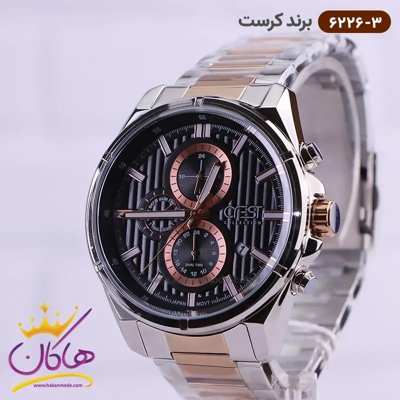 ساعت کرست مردانه فلزی صفحه مشکی راه راه مدل 6226/3 ظاهری کلاسیک و جذاب دارد. این ساعت بند استیل نقرهای/رزگلد، رنگ ثابت و ضدحساسیت است. اصلیترین چیزی که در ساعت مردانه کرست توجه ما را به خود جلب میکند، سه صفحه دایرهای کوچک است، که درون صفحه هستند. دایرههای موجود در صفحهی مشکی و طرحدار ساعت، هر کدام نشان دهندهی پارامتری خاص هستند. صفحهی بالایی، ساعت را به صورت ۲۴ ساعت نشان میدهد. صفحهی سمت چپ روزهای هفته را نشان میدهد. دایرهی پایینی نشان دهندهی ساعت جهانی است. یک مربع کوچک بین اعداد ۴ و ۵ قرار دارد که نشانگر روزهای ماه بوده و همان تقویم ساعت نیز است. عقربهها، شبنما و اندکسها خطی و شبنما هستند. اگر به درون صفحه نگاه کنید، نام برند crest زیر ساعت 12 دیده میشود. در کنار صفحه سه پیچ کوک برای تنظیم زمان وجود دارد. بند ساعت، فلزی و از نوع استیل مرغوب است که باعث تعرق و خارش نمیشود. طرح این بند از یک بافت ریز و درشت تشکیل شده است و قفل آن از مدل سهتکه دکمهدار است که از دسته قفلهای محکم و مطمئن است.