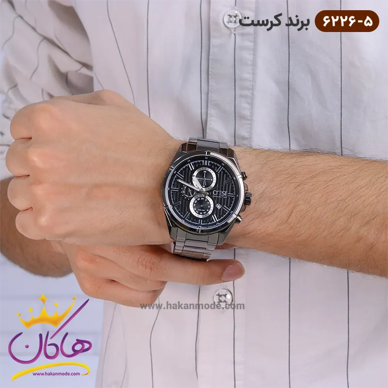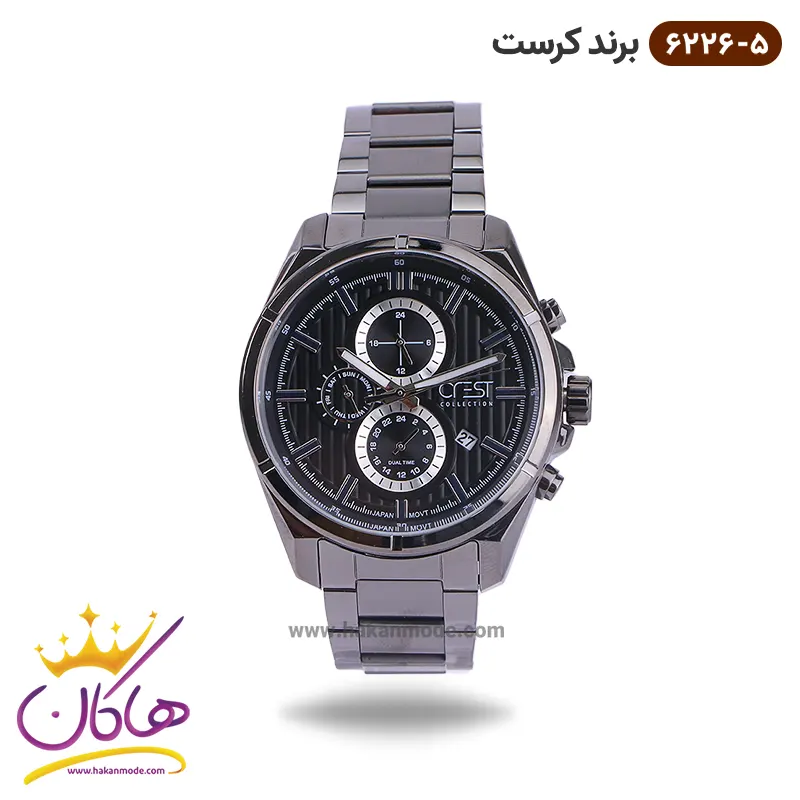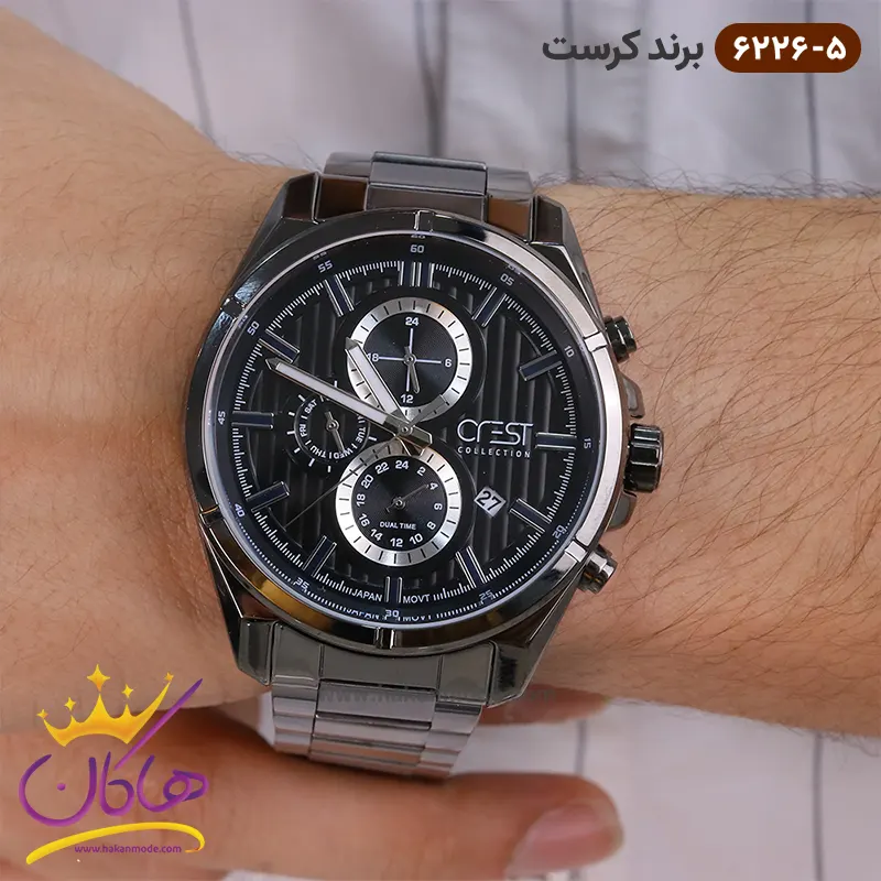 ساعت کرست مردانه فلزی مدل 6226/5 ظاهری مدرن و جذاب دارد. این ساعت بند استیل مشکی، رنگ ثابت و ضدحساسیت است. اصلی‌ترین چیزی که در ساعت مردانه کرست توجه ما را به خود جلب می‌کند، سه صفحه دایره‌ای کوچک است، که درون صفحه هستند. دایره‌های موجود در صفحه‌ی مشکی راه راه این ساعت، هر کدام نشان دهنده‌ی پارامتری خاص هستند. یک صفحه ساعت را به صورت ۲۴ ساعت نشان می‌دهد. گزینه بعدی روزهای هفته را نشان می‌دهد. دایره‌ی بعدی نشان دهنده‌ی ساعت جهانی است. در سمت راست مربعی کوچک وجود دارد که نشانگر روز‌های ماه بوده و همان تقویم ساعت نیز است. عقربه‌های نقره‌ای، شبنما و اندکس‌ها خطی مشکی هستند. اگر به درون صفحه نگاه کنید، نام برند crest زیر ساعت 12 دیده می‌شود. در کنار صفحه یک پیچ کوک و دو دکمه برای تنظیم زمان وجود دارد. بند ساعت، فلزی و از نوع استیل مرغوب است که باعث تعرق و خارش نمی‌شود. طرح این بند از یک بافت ریز و درشت تشکیل شده است و قفل آن از مدل پروانه‌ای است که از دسته قفل‌های محکم و مطمئن است.