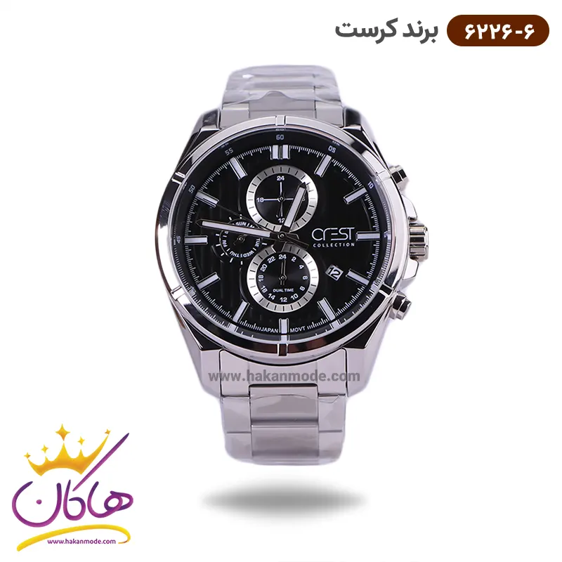 ساعت کرست مردانه فلزی مدل 6226/6 ظاهری کلاسیک و جذاب دارد. این ساعت بند استیل نقره‌ای، رنگ ثابت و ضدحساسیت است. اصلی‌ترین چیزی که در ساعت مردانه کرست توجه ما را به خود جلب می‌کند، سه صفحه دایره‌ای کوچک است، که درون صفحه هستند. دایره‌های موجود در صفحه‌ی مشکی و طرح‌دار ساعت، هر کدام نشان دهنده‌ی پارامتری خاص هستند. صفحه‌ی بالایی، ساعت را به صورت ۲۴ ساعت نشان می‌دهد. صفحه‌ی سمت چپ روزهای هفته را نشان می‌دهد. دایره‌ی پایینی نشان دهنده‌ی ساعت جهانی است. یک مربع کوچک بین اعداد ۴ و ۵ قرار دارد که نشانگر روز‌های ماه بوده و همان تقویم ساعت نیز است. عقربه‌ها، شبنما و اندکس‌ها خطی و شبنما هستند. اگر به درون صفحه نگاه کنید، نام برند crest کنار ساعت ۳ دیده می‌شود. در کنار صفحه سه پیچ کوک برای تنظیم زمان وجود دارد. بند ساعت، فلزی و از نوع استیل مرغوب است که باعث تعرق و خارش نمی‌شود. طرح این بند از یک بافت ریز و درشت تشکیل شده است و قفل آن از مدل سه‌تکه دکمه‌دار است که از دسته قفل‌های محکم و مطمئن است.