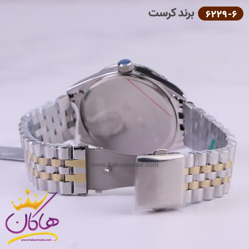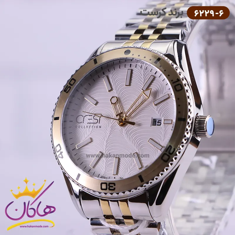 ساعت کرست مردانه فلزی صفحه سفید مدل 6229/6 ظاهری کلاسیک و جذاب دارد. اصلی‌ترین چیزی که در ساعت مردانه کرست توجه ما را به خود جلب می‌کند، هم‌خوانی رنگ بند با قاب طلایی ساعت است. قاب این ساعت کنگره‌ای است. اگر به درون صفحه‌ی سفید رنگ و طرح‌دار ساعت نگاه کنید، اندکس‌های این ساعت خطی و عقربه‌های آن تا به تا و شبنما هستند. در کنار موقعیت عدد 3 مربع کوچکی وجود دارد که نشان‌دهنده‌ی تقویم ساعت است. دور تا دور قاب این ساعت یکسری اعداد وجود دارد که همان دقیقه‌ی ساعت را نشان می‌دهد. نام برند crest در موقعیت ساعت 9 دیده می‌شود. در کنار صفحه یک پیچ کوک برای تنظیم زمان وجود دارد. این ساعت بند استیل، رنگ ثابت و ضدحساسیت است. بند ساعت از یک بافت یکدست تشکیل شده است که طلایی و نقره‌ای رنگ است. این بند باعث تعرق و خارش نمی‌شود و قفل آن از مدل سه‌تکه دکمه‌دار است که از دسته قفل‌های محکم و مطمئن است.
