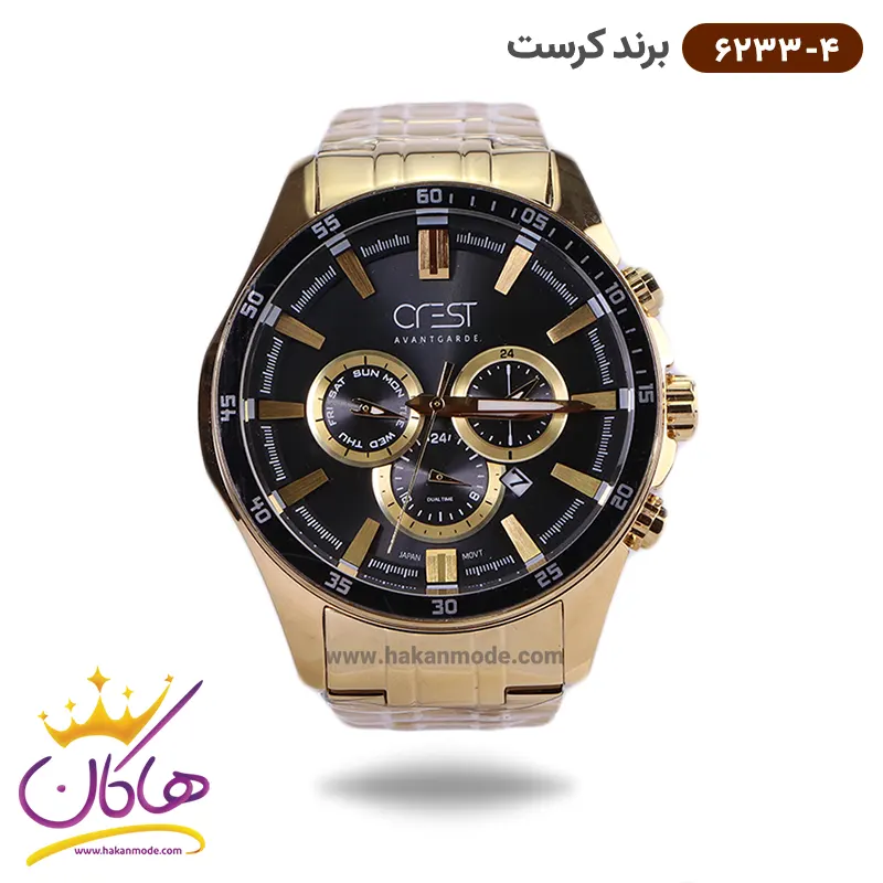 ساعت کرست مردانه فلزی مدل 6233/4 ظاهری کلاسیک و جذاب دارد. این ساعت بند استیل طلایی، رنگ ثابت و ضدحساسیت است. اصلیترین چیزی که در ساعت مردانه کرست توجه ما را به خود جلب میکند، سه صفحه دایرهای کوچک طلایی است، که درون صفحه هستند. دایرههای موجود در صفحهی مشکی ساعت، هر کدام نشان دهندهی پارامتری خاص هستند. صفحهی سمت راست، ساعت را به صورت ۲۴ ساعت نشان میدهد. صفحهی سمت چپ روزهای هفته را نشان میدهد. دایرهی وسطی نشان دهندهی ساعت جهانی است. یک مربع کوچک بین اعداد ۴ و ۵ قرار دارد که نشانگر روزهای ماه بوده و همان تقویم ساعت نیز است. عقربهها، شبنما و اندکسها خطی طلایی هستند. اگر به درون صفحه نگاه کنید، نام برند crest زیر ساعت 12 دیده میشود. در کنار صفحه سه پیچ کوک برای تنظیم زمان وجود دارد. بند ساعت، فلزی و از نوع استیل مرغوب است که باعث تعرق و خارش نمیشود. طرح این بند از یک بافت ریز و درشت تشکیل شده است و قفل آن از مدل سهتکه دکمهدار است که از دسته قفلهای محکم و مطمئن است.