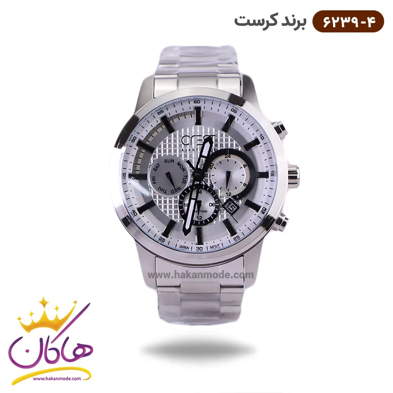 ساعت کرست مردانه فلزی دو زمانه صفحه شطرنجی مدل 6239/4 ظاهری کلاسیک و جذاب دارد. این ساعت بند استیل نقرهای، رنگ ثابت و ضدحساسیت است. اصلیترین چیزی که در ساعت مردانه کرست توجه ما را به خود جلب میکند، سه صفحه دایرهای کوچک است، که درون صفحه هستند. دایرههای موجود در صفحهی سفید رنگ ساعت، هر کدام نشان دهندهی پارامتری خاص هستند. صفحهی سمت راست، ساعت را به صورت ۲۴ ساعت نشان میدهد. صفحهی سمت چپ روزهای هفته را نشان میدهد. دایرهی وسطی نشان دهندهی ساعت جهانی است. یک مربع کوچک بین اعداد ۴ و ۵ قرار دارد که نشانگر روزهای ماه بوده و همان تقویم ساعت نیز است. عقربهها، شبنما و اندکسها خطی و مشکی هستند. اگر به درون صفحه نگاه کنید، نام برند crest زیر ساعت 12 دیده میشود. در کنار صفحه سه پیچ کوک برای تنظیم زمان وجود دارد. بند ساعت، فلزی و از نوع استیل مرغوب است که باعث تعرق و خارش نمیشود. طرح این بند از یک بافت ریز و درشت تشکیل شده است و قفل آن از مدل سهتکه دکمهدار است که از دسته قفلهای محکم و مطمئن است.