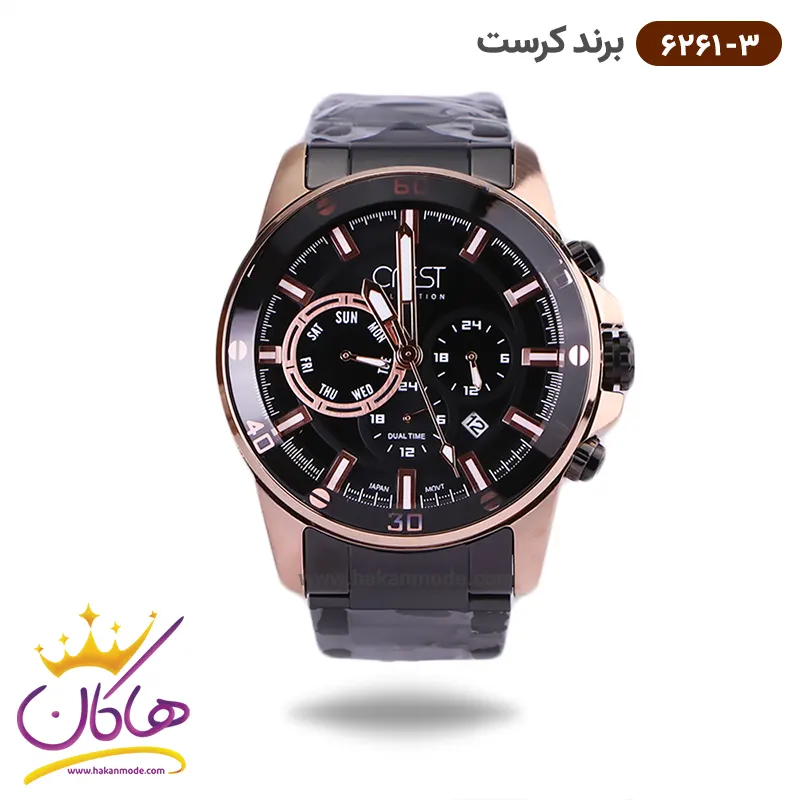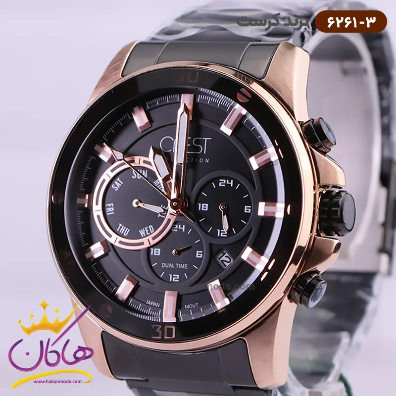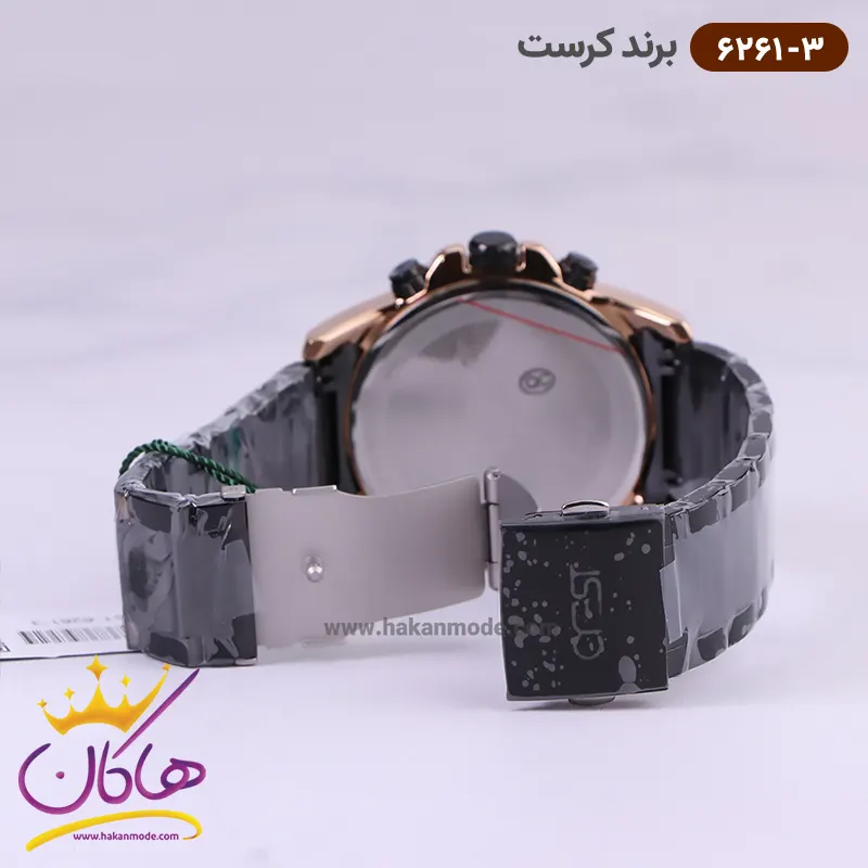 ساعت کرست مردانه فلزی مدل 6261/3 ظاهری مدرن و جذاب دارد. این ساعت بند استیل مشکی/رزگلد، رنگ ثابت و ضدحساسیت است. اصلی‌ترین چیزی که در ساعت مردانه کرست توجه ما را به خود جلب می‌کند، سه صفحه دایره‌ای کوچک است، که درون صفحه هستند. دایره‌های موجود در صفحه‌ی مشکی رنگ این ساعت، هر کدام نشان دهنده‌ی پارامتری خاص هستند. یک صفحه ساعت را به صورت ۲۴ ساعت نشان می‌دهد. گزینه بعدی روزهای هفته را نشان می‌دهد. دایره‌ی بعدی نشان دهنده‌ی ساعت جهانی است. در سمت راست یک مربع کوچک وجود دارد که نشانگر روز‌های ماه بوده و همان تقویم ساعت نیز است. عقربه‌ها رزگلد، شبنما و اندکس‌ها خطی رزگلد هستند. اگر به درون صفحه نگاه کنید، نام برند crest زیر ساعت ۱۲ دیده می‌شود. در کنار صفحه یک پیچ کوک و دو دکمه برای تنظیم زمان وجود دارد. بند ساعت، فلزی و از نوع استیل مرغوب است که باعث تعرق و خارش نمی‌شود. طرح این بند از یک بافت ریز و درشت تشکیل شده است و قفل آن از مدل سه‌تکه دکمه‌دار است که از دسته قفل‌های محکم و مطمئن است.