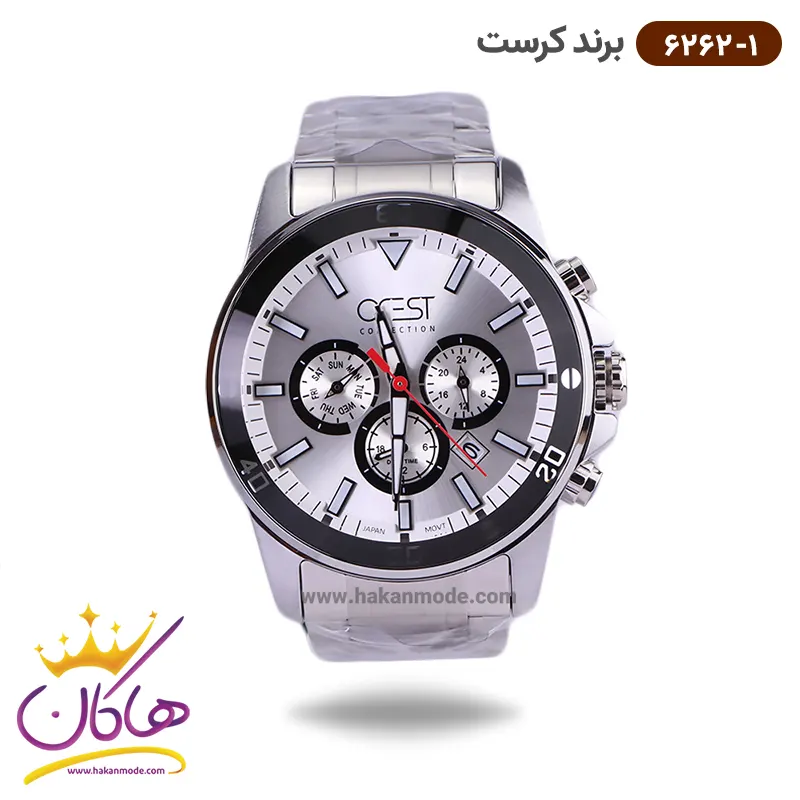 ساعت کرست مردانه فلزی مدل 6262/1 ظاهری کلاسیک و جذاب دارد. این ساعت بند استیل نقره‌ای، رنگ ثابت و ضدحساسیت است. اصلی‌ترین چیزی که در ساعت مردانه کرست توجه ما را به خود جلب می‌کند، سه صفحه دایره‌ای کوچک است، که درون صفحه هستند. دایره‌های موجود در صفحه‌ی نقره‌ای ساعت، هر کدام نشان دهنده‌ی پارامتری خاص هستند. صفحه‌ی سمت راست، ساعت را به صورت ۲۴ ساعت نشان می‌دهد. صفحه‌ی سمت چپ روزهای هفته را نشان می‌دهد. دایره‌ی وسطی نشان دهنده‌ی ساعت جهانی است. یک مربع کوچک بین اعداد ۴ و ۵ قرار دارد که نشانگر روز‌های ماه بوده و همان تقویم ساعت نیز است. عقربه‌ها، شبنما و اندکس‌ها شبنما و نقره‌ای هستند. ثانیه شمار این ساعت قرمز رنگ طراحی شده است. اگر به درون صفحه نگاه کنید، نام برند crest زیر ساعت 12 دیده می‌شود. در کنار صفحه سه پیچ کوک برای تنظیم زمان وجود دارد. بند ساعت، فلزی و از نوع استیل مرغوب است که باعث تعرق و خارش نمی‌شود. طرح این بند از یک بافت ریز و درشت تشکیل شده است و قفل آن از مدل سه‌تکه دکمه‌دار است که از دسته قفل‌های محکم و مطمئن است.