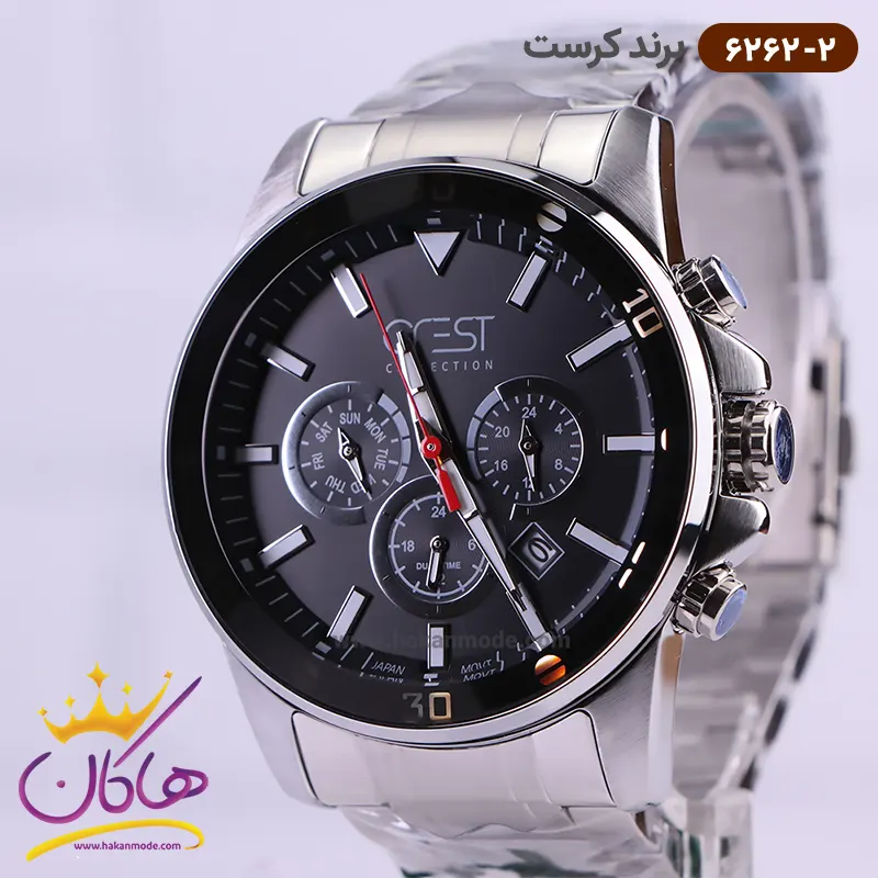 ساعت کرست مردانه فلزی مدل 6262/2 ظاهری کلاسیک و جذاب دارد. این ساعت بند استیل نقره‌ای، رنگ ثابت و ضدحساسیت است. اصلی‌ترین چیزی که در ساعت مردانه کرست توجه ما را به خود جلب می‌کند، سه صفحه دایره‌ای کوچک است، که درون صفحه هستند. دایره‌های موجود در صفحه‌ی مشکی ساعت، هر کدام نشان دهنده‌ی پارامتری خاص هستند. صفحه‌ی سمت راست، ساعت را به صورت ۲۴ ساعت نشان می‌دهد. صفحه‌ی سمت چپ روزهای هفته را نشان می‌دهد. دایره‌ی وسطی نشان دهنده‌ی ساعت جهانی است. یک مربع کوچک بین اعداد ۴ و ۵ قرار دارد که نشانگر روز‌های ماه بوده و همان تقویم ساعت نیز است. عقربه‌ها، شبنما و اندکس‌ها شبنما و نقره‌ای هستند. ثانیه شمار این ساعت قرمز رنگ طراحی شده است. اگر به درون صفحه نگاه کنید، نام برند crest زیر ساعت 12 دیده می‌شود. در کنار صفحه سه پیچ کوک برای تنظیم زمان وجود دارد. بند ساعت، فلزی و از نوع استیل مرغوب است که باعث تعرق و خارش نمی‌شود. طرح این بند از یک بافت ریز و درشت تشکیل شده است و قفل آن از مدل سه‌تکه دکمه‌دار است که از دسته قفل‌های محکم و مطمئن است.
