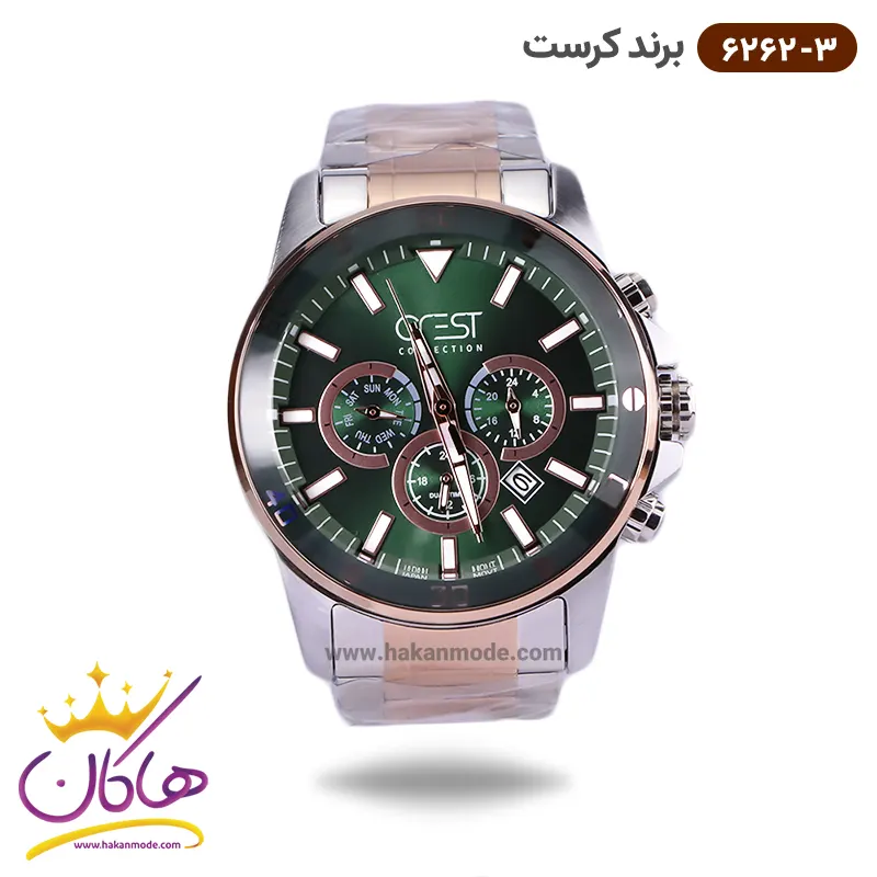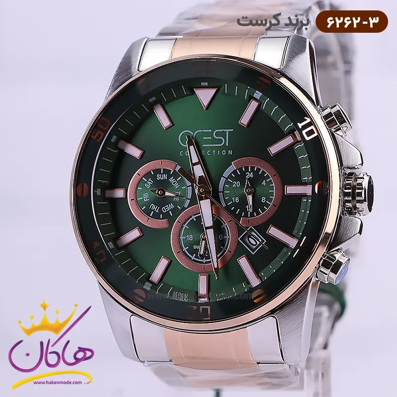 ساعت کرست مردانه فلزی مدل 6262/3 ظاهری کلاسیک و جذاب دارد. این ساعت بند استیل نقرهای/رزگلد، رنگ ثابت و ضدحساسیت است. اصلیترین چیزی که در ساعت مردانه کرست توجه ما را به خود جلب میکند، سه صفحه دایرهای کوچک است، که درون صفحه هستند. دایرههای موجود در صفحهی سبز ساعت، هر کدام نشان دهندهی پارامتری خاص هستند. صفحهی سمت راست، ساعت را به صورت ۲۴ ساعت نشان میدهد. صفحهی سمت چپ روزهای هفته را نشان میدهد. دایرهی وسطی نشان دهندهی ساعت جهانی است. یک مربع کوچک بین اعداد ۴ و ۵ قرار دارد که نشانگر روزهای ماه بوده و همان تقویم ساعت نیز است. عقربهها، شبنما و اندکسها شبنما و رزگلد هستند. اگر به درون صفحه نگاه کنید، نام برند crest زیر ساعت 12 دیده میشود. در کنار صفحه سه پیچ کوک برای تنظیم زمان وجود دارد. بند ساعت، فلزی و از نوع استیل مرغوب است که باعث تعرق و خارش نمیشود. طرح این بند از یک بافت ریز و درشت تشکیل شده است و قفل آن از مدل سهتکه دکمهدار است که از دسته قفلهای محکم و مطمئن است.