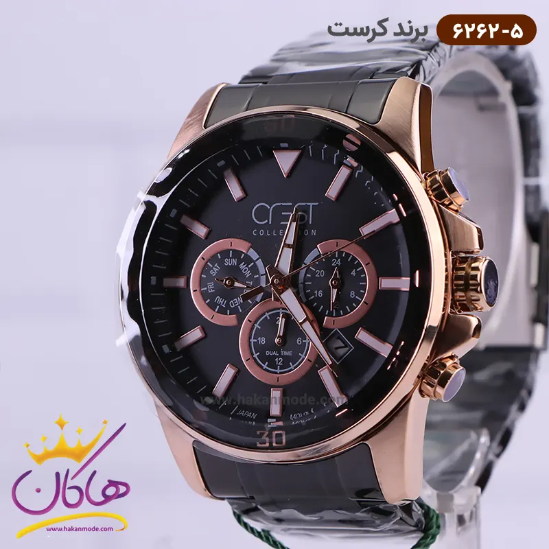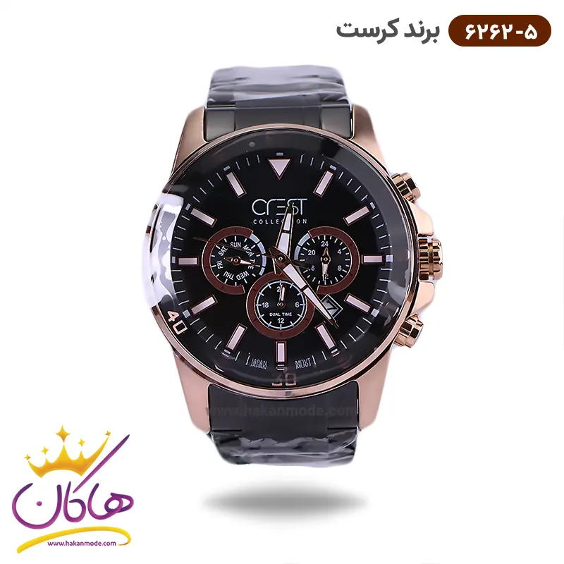 ساعت کرست مردانه فلزی مشکی دو زمانه مدل 6262/5 ظاهری کلاسیک و جذاب دارد. این ساعت بند استیل مشکی/رزگلد، رنگ ثابت و ضدحساسیت است. اصلی‌ترین چیزی که در ساعت مردانه کرست توجه ما را به خود جلب می‌کند، سه صفحه دایره‌ای کوچک است، که درون صفحه هستند. دایره‌های موجود در صفحه‌ی مشکی ساعت، هر کدام نشان دهنده‌ی پارامتری خاص هستند. صفحه‌ی سمت راست، ساعت را به صورت ۲۴ ساعت نشان می‌دهد. صفحه‌ی سمت چپ روزهای هفته را نشان می‌دهد. دایره‌ی وسطی نشان دهنده‌ی ساعت جهانی است. یک مربع کوچک بین اعداد ۴ و ۵ قرار دارد که نشانگر روز‌های ماه بوده و همان تقویم ساعت نیز است. عقربه‌ها، شبنما و اندکس‌ها شبنما و رزگلد هستند. اگر به درون صفحه نگاه کنید، نام برند crest زیر ساعت 12 دیده می‌شود. در کنار صفحه سه پیچ کوک برای تنظیم زمان وجود دارد. بند ساعت، فلزی و از نوع استیل مرغوب است که باعث تعرق و خارش نمی‌شود. طرح این بند از یک بافت ریز و درشت تشکیل شده است و قفل آن از مدل سه‌تکه دکمه‌دار است که از دسته قفل‌های محکم و مطمئن است.