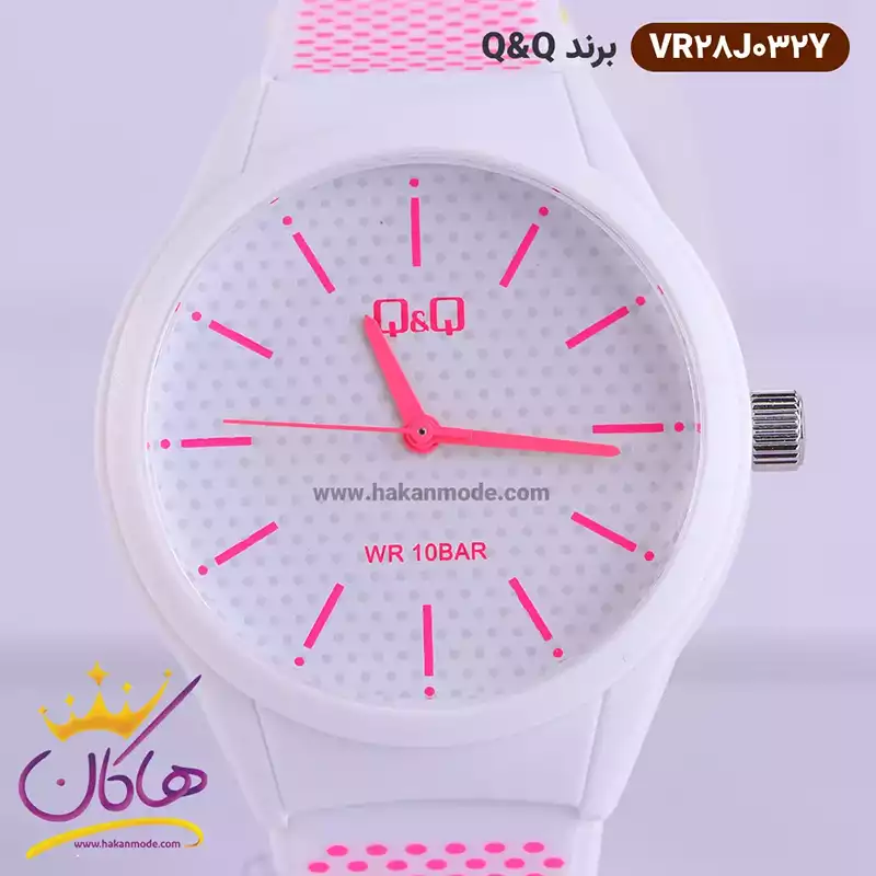 علاوه بر ویژگی های ظاهری اگر به داخل ساعت نگاه کنید، یک صفحه خال خالی سفید مشاهده می کنید که می تواند جذابیت استایل های مدرن را دو چندان کند. اندکس های این ساعت به شکل خطی و صورتی رنگ طراحی شده اند به همراه لوگو برند کیو اند کیو در صفحه به چشم می آید. وجود ثانیه شمار و عقربه های صورتی بر جذابیت این ساعت افزوده است.بند این ساعت سفید به همراه خال های صورتی است که همخوانی خاصی با قاب و صفحه ی خال خالی سفید ساعت دارد. این ساعت تک موتوره است و چون موتور تمام انرژی خود را فقط صرف چرخاندن عقربه ها می کند، هم موتور و هم باتری طول عمر بیشتری دارند. قفل این ساعت از نوع سگکی است و ساعت به راحتی از دست نمیافتد. ساعت کیو اند کیو سفید بند خال خالی VR28J032Y مهمترین دلیل جذابیت آن است.