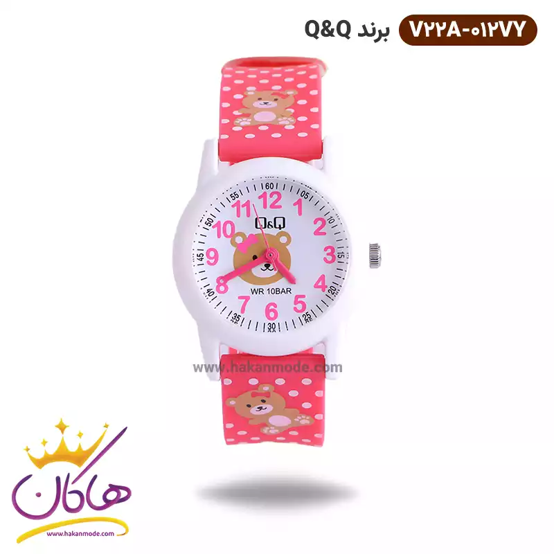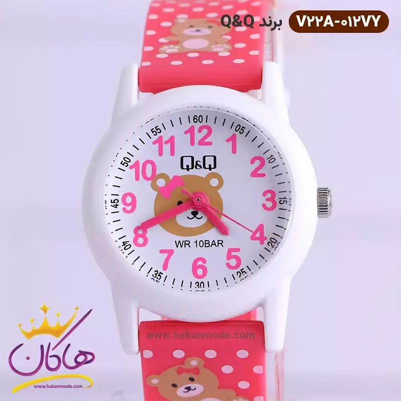 بهترین قیمت ساعت دخترانه کیو اند کیو صورتی طرح خرسV22A-012VY