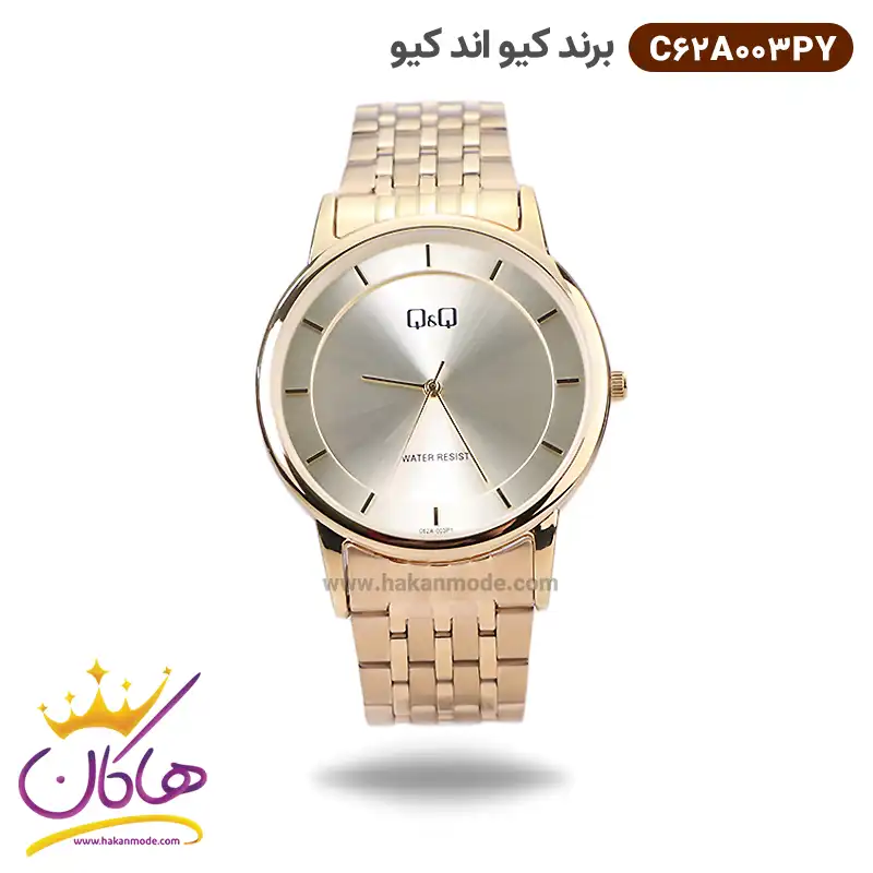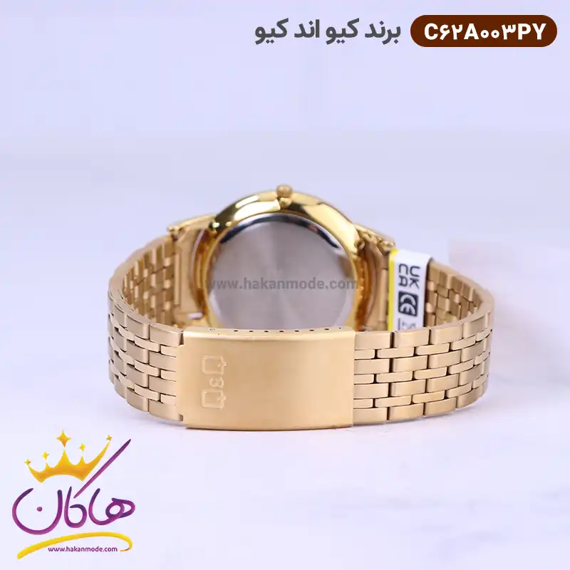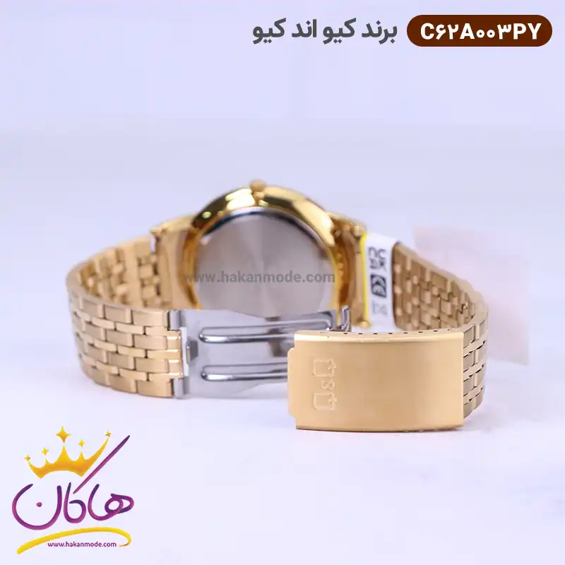 ساعت کیو اند کیو مردانه استیل طلایی C62A-003PY ظاهری کلاسیک و جذاب دارد. این ساعت استیل طلایی، رنگ ثابت و ضدحساسیت است. اصلی‌ترین چیزی که در ساعت کیو اند کیو مردانه توجه ما را به خود جلب می‌کند هماهنگی جالب بین صفحه طلایی و قاب طلایی رنگ است. در این صفحه اندکس‌های خطی و عقربه‌های ظریف دیده می‌شود. نام برند کیو اند کیو زیر ساعت 12 و بالای عدد شش water resist دیده می‌شود که نشان دهنده ضدآب بودن این ساعت است. در کنار صفحه یک پیچ کوک برای تنظیم زمان وجود دارد. بند ساعت، از یک بافت ریز و درشت تشکیل شده است. همچنین جنس بند فلزی و از نوع استیل مرغوب است که باعث تعرق و خارش نمی‌شود. قفل آن از مدل دو تکه است که از دسته قفل‌های محکم و مطمئن است.