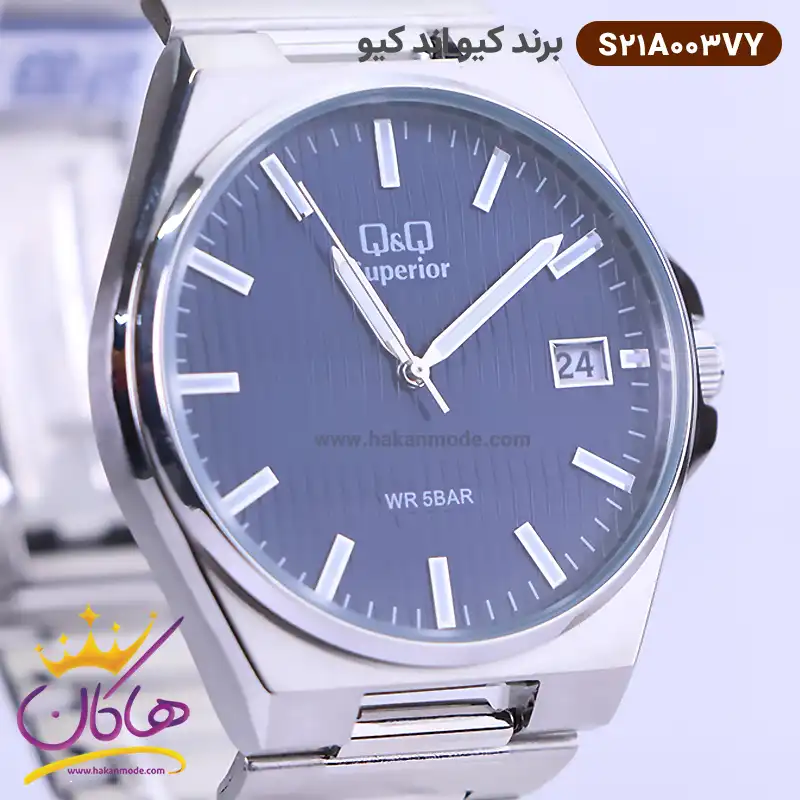 ساعت کیو اند کیو مردانه فلزی صفحه سورمه ای S21A-003VY ظاهری کلاسیک و جذاب دارد. این ساعت استیل نقرهای، رنگ ثابت و ضدحساسیت است. اصلیترین چیزی که در ساعت کیو اند کیو مردانه توجه ما را به خود جلب میکند همخوانی رنگ بند با قاب نقرهای ساعت است. صفحهی این ساعت سورمه ای و راه راه بوده و اندکسهای آن خطی و شبنما طراحی شدهاند. یک مربع کوچک کنار ساعت 3 قرار دارد که همان تقویم ساعت است. نام برند کیو اند کیو زیر ساعت 12 دیده میشود. در کنار صفحه یک پیچ کوک برای تنظیم زمان وجود دارد. بند ساعت، از یک بافت مستطیلی ریز و درشت تشکیل شده که نقره ای است. همچنین جنس بند فلزی و از نوع استیل مرغوب است که باعث تعرق و خارش نمیشود. قفل آن از مدل دو تکه است که از دسته قفلهای محکم و مطمئن است.