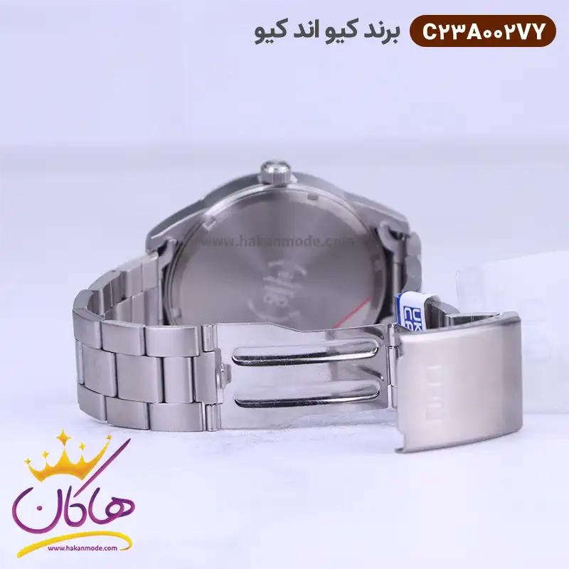 ساعت کیو اند کیو مردانه فلزی نقره ای C23A-002VY ظاهری کلاسیک و جذاب دارد. این ساعت استیل نقره ای، رنگ ثابت و ضدحساسیت است. اصلی‌ترین چیزی که در ساعت کیو اند کیو مردانه توجه ما را به خود جلب می‌کند همخوانی رنگ بند با قاب نقره ای ساعت است. صفحه‌ی این ساعت به رنگ سورمه ای بوده و اندکس‌‌های آن خطی طراحی شده‌اند. نام برند کیو اند کیو زیر ساعت 12 دیده می‌شود. در کنار صفحه یک پیچ کوک برای تنظیم زمان وجود دارد. بند ساعت، از یک بافت ریز و درشت تشکیل شده است. همچنین جنس بند فلزی و از نوع استیل مرغوب است که باعث تعرق و خارش نمی‌شود. قفل آن از مدل دو تکه است که از دسته قفل‌های محکم و مطمئن است.
