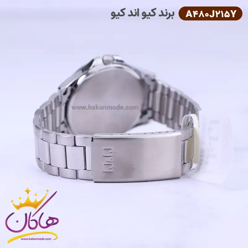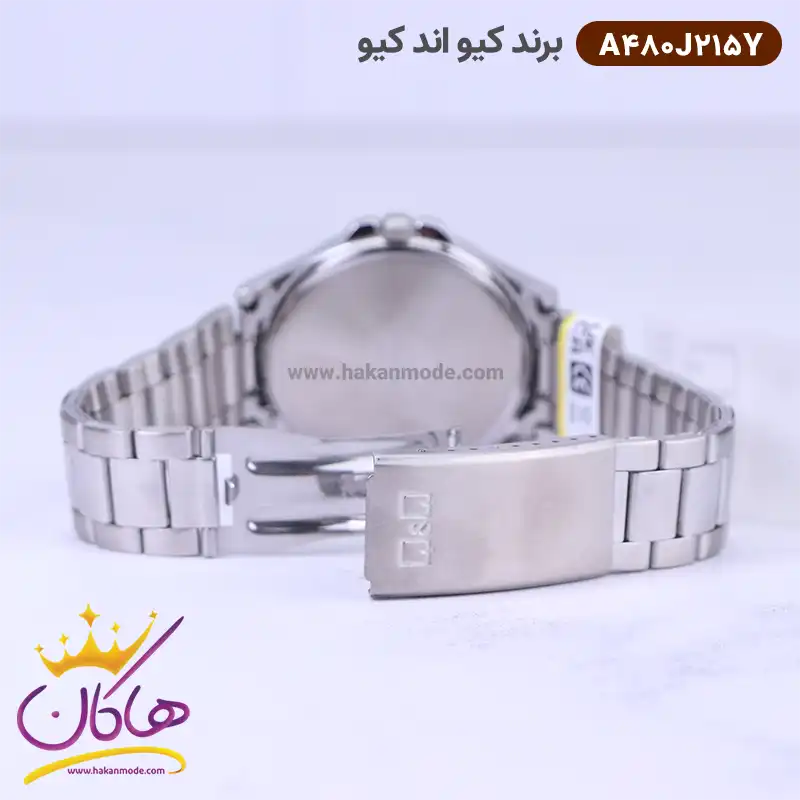 ساعت کیو اند کیو مردانه نقره ای صفحه آبی A480J215Y ظاهری کلاسیک و جذاب دارد. این ساعت استیل نقره ای، رنگ ثابت و ضدحساسیت است. اصلی‌ترین چیزی که در ساعت کیو اند کیو مردانه توجه ما را به خود جلب می‌کند همخوانی رنگ بند با قاب نقره ای ساعت است. صفحه‌ی این ساعت به رنگ آبی بوده و اندکس‌‌های آن عددی طراحی شده‌اند. در کنار عدد سه نمایشگر تقویم را می‌بینید. نام برند کیو اند کیو زیر ساعت 12 و بالای عدد شش water resist دیده می‌شود که نشان دهنده ضدآب بودن این ساعت است. در کنار صفحه یک پیچ کوک برای تنظیم زمان وجود دارد. بند ساعت، از یک بافت ریز و درشت تشکیل شده است. همچنین جنس بند فلزی و از نوع استیل مرغوب است که باعث تعرق و خارش نمی‌شود. قفل آن از مدل دو تکه است که از دسته قفل‌های محکم و مطمئن است.