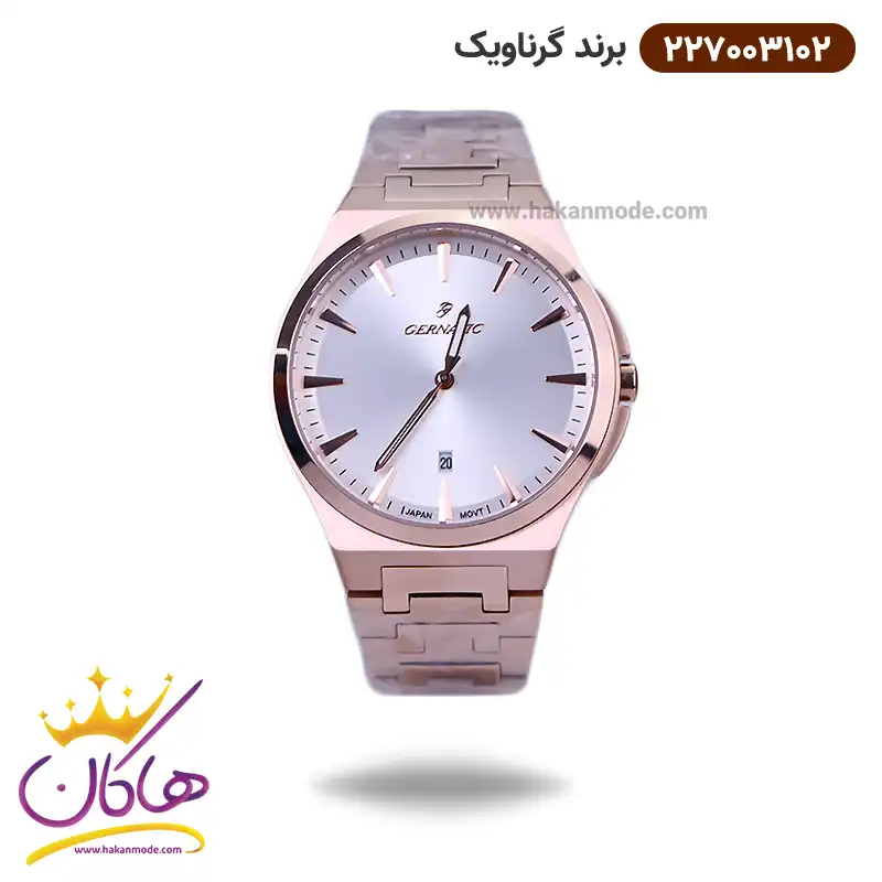 ساعت گرناویک مردانه فلزی تمام رزگلد 227003102 ظاهری کلاسیک و جذاب دارد. این ساعت استیل رزگلد، رنگ ثابت و ضدحساسیت است. اصلی‌ترین چیزی که در ساعت گرناویک مردانه توجه ما را به خود جلب می‌کند همخوانی رنگ بند با قاب رزگلد ساعت است. صفحه‌ی این ساعت سفید بوده و اندکس‌‌های آن خطی و رزگلد طراحی شده‌اند. یک مربع کوچک در کنار ساعت 6 وجود دارد که همان تقویم ساعت است. نام برند Gernavic زیر ساعت 12 دیده می‌شود. در کنار صفحه یک پیچ کوک برای تنظیم زمان وجود دارد. بند ساعت، از یک بافت تو در تو تشکیل شده و رزگلد است. همچنین جنس بند فلزی و از نوع استیل مرغوب است که باعث تعرق و خارش نمی‌شود. قفل آن از مدل پروانه‌ای دکمه‌دار است که از دسته قفل‌های محکم و مطمئن است.
