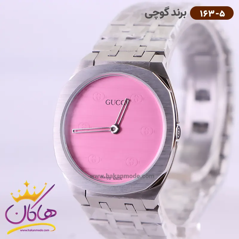 ساعت گوچی زنانه فلزی مدل 163/5 ظاهری کلاسیک و جذاب دارد. این ساعت استیل نقرهای، رنگ ثابت و ضدحساسیت است. اصلیترین چیزی که در ساعت زنانه گوچی توجه ما را به خود جلب میکند، همخوانی رنگ بند با قاب نقرهای ساعت است. اگر به درون ساعت دقت کنید، صفحهی ساعت صورتی رنگ و ساده است که عقربهها، نقرهای و تو خالی هستند و هیچگونه اندکسی ندارد. نام برند Gucci زیر ساعت 12 دیده میشود. در کنار صفحه یک پیچ کوک برای تنظیم زمان وجود دارد. بند ساعت، فلزی و از نوع استیل مرغوب است که باعث تعرق و خارش نمیشود. طرح این بند از یک بافت ریز و درشت تشکیل شده است و قفل این ساعت عقربهای زنانه از مدل پروانهای است که از دسته قفلهای محکم و مطمئن است.