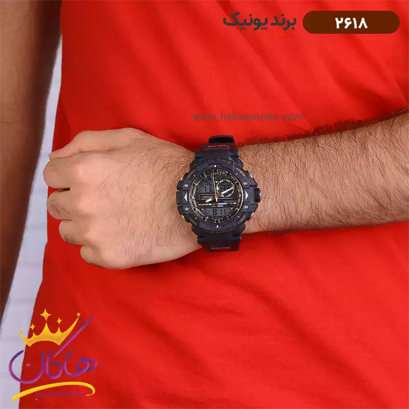 ساعت یونیک مردانه دو زمانه دیجیتالی مشکی 2618 نمای روی دست نزدیک