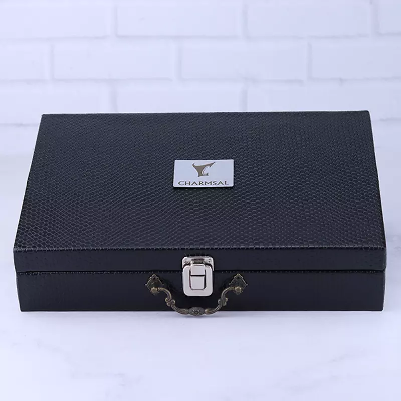 ست چرمی مردانه با کیف کتی و عینک و جاکلیدی چرمسال مشکی درون جعبه