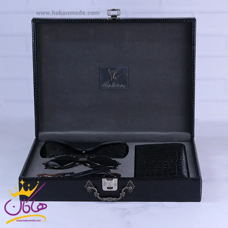 ست کیف کتی چرم و عینک مردانه چرمسال مشکی 182/1 درون جعبه