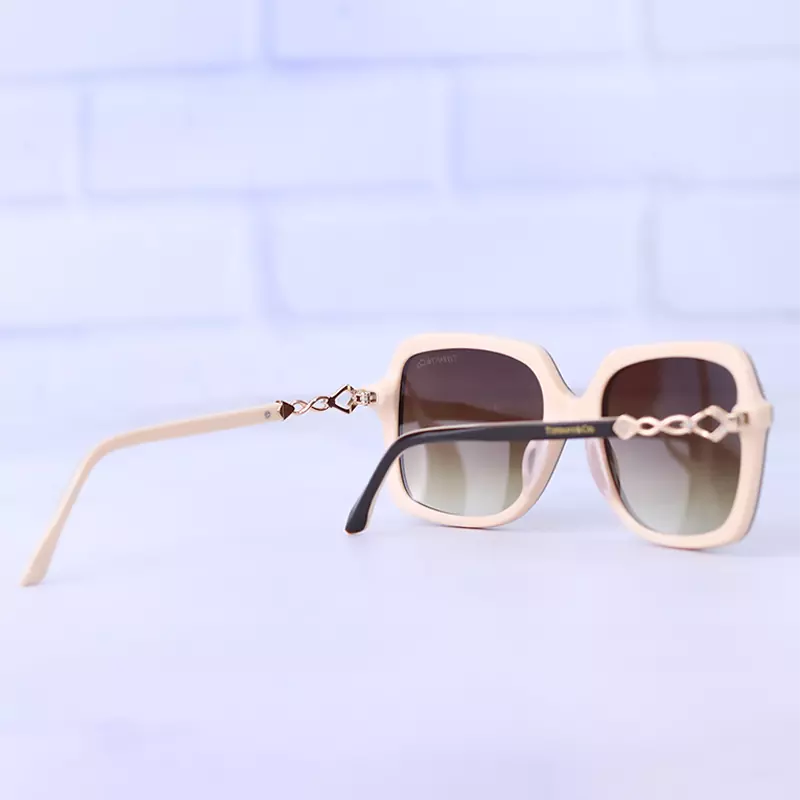 فریم این عینک که مهمترین قسمت آن است از نوع تمام فریم و به شکل مربع است. این فریم قهوهای جذاب به خوبی روی چشم قرار می گیرد. پهنای عینک آفتابی تیفانی زنانه حدود 12.9 سانتیمتر است. افرادی که صورتهای گرد، قلبی و بیضی دارند، از طرفداران این مدل عینک هستند. پل عینک، کائوچو و بینی گیر آن از جنس بدنه عینک است. رنگ عدسی قهوهای و عرض آن حدود 5.5 سانت است و چشم را کامل میپوشاند و در وسعت دید اشکالی به وجود نمیآورد. عرض پل 1.9 سانت است و به خوبی روی بینی مینشیند. دسته عینک به رنگ قهوهای و نماد برند تیفانی روی آن دیده میشود. دسته تزئین شده فلزی که طرحی لوزی شکل دارد و نگین کاری شده، نمای کناری عینک را شیک و بی نظیر کرده است. نمای پشت عینک کرم رنگ طراحی شده است. طول دسته حدود 14 سانتیمتر است و با یک قوس ملایم تا پشت گوش میرود. سبکی این عینک کمک میکند تا ساعتهای طولانی یا هنگام رانندگی، عینک را به چشم بزنید و ابدا در قسمت گوشها یا بینی احساس سنگینی و خستگی نکنید.