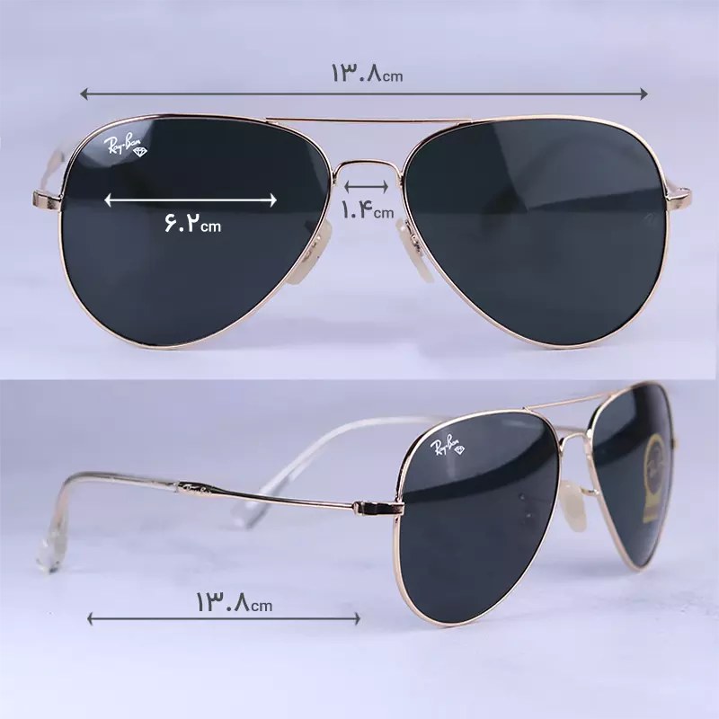 ابعاد عینک آفتابی ری بن مردانه فلزی طلایی عدسی مشکی RB 3026 F/5