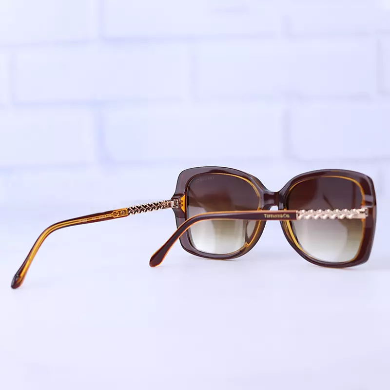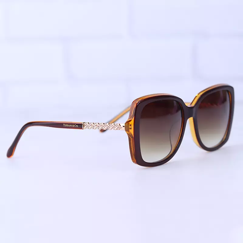 فریم این عینک که مهمترین قسمت آن است از نوع تمام فریم و به شکل پروانه‌ای است. این فریم قهوه‌ای جذاب به خوبی روی چشم قرار می گیرد. پهنای عینک آفتابی تیفانی زنانه حدود 12.9 سانتی‌متر است. افرادی که صورت‌های لوزی و مربع دارند، از طرفداران این مدل عینک هستند. پل عینک، کائوچو و بینی گیر آن از جنس بدنه عینک است. رنگ عدسی قهوه‌ای و عرض آن حدود 5.6 سانت است و چشم را کامل می‌پوشاند و در وسعت دید اشکالی به وجود نمی‌آورد. عرض پل 1.7 سانت است و به خوبی روی بینی می‌نشیند. دسته عینک به رنگ قهوه‌ای و نماد برند تیفانی روی آن دیده می‌شود. دسته تزئین شده فلزی که طرحی شبیه به خوشه گندم دارد و نگین کاری شده، نمای کناری عینک را شیک و بی نظیر کرده است. طول دسته حدود 14 سانتی‌متر است و با یک قوس ملایم تا پشت گوش می‌رود. سبکی این عینک کمک می‌کند تا ساعت‌های طولانی یا هنگام رانندگی، عینک را به چشم بزنید و ابدا در قسمت گوش‌ها یا بینی احساس سنگینی و خستگی نکنید.