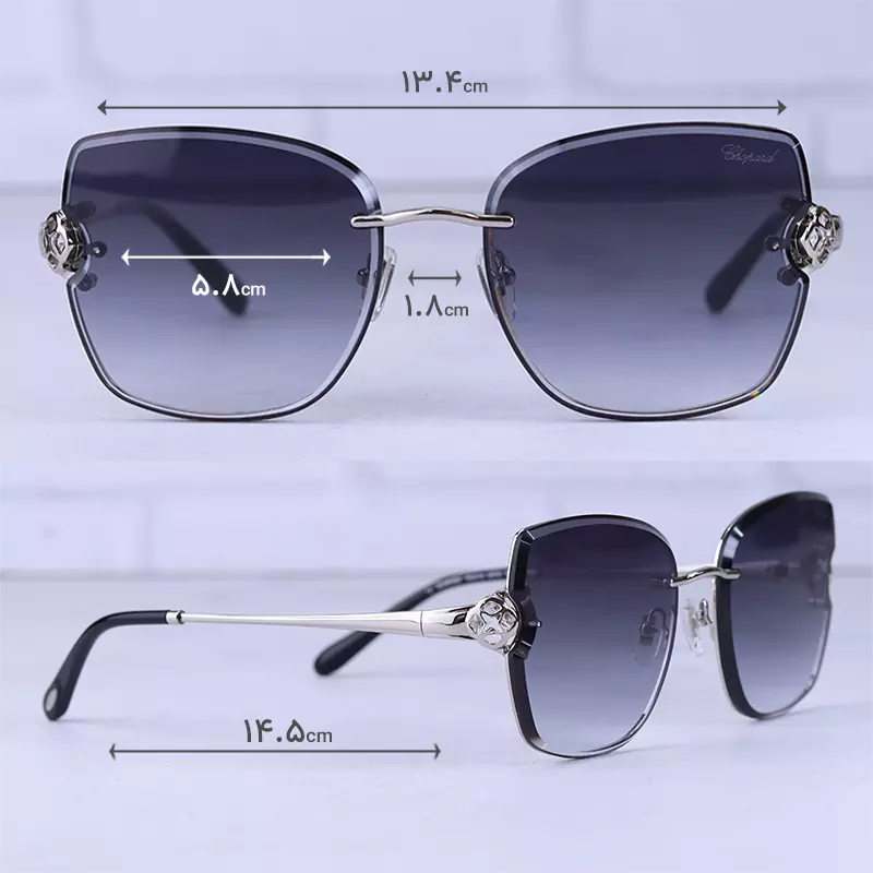 فریم این عینک که مهمترین قسمت آن است به شکل مربع و تمام فریم است. این فریم نقرهای جذاب به خوبی روی چشم قرار میگیرد. عینک آفتابی شوپارد زنانه با پهنای حدود 13.4 سانتیمتر تقریبا برای صورتهای گرد، بیضی و قلبی شکل مناسب است. پل عینک، فلزی و بینی گیر آن لاستیکی بی رنگ و بسیار نرم و منطف است. رنگ عدسی دودی و عرض آن حدود 5.8 سانت است و چشم را کامل میپوشاند و در وسعت دید اشکالی به وجود نمیآورد. عرض پل 1.8 است و به خوبی روی بینی مینشیند. دستههای این عینک فلزی نقرهای با طراحی ظریف و جزئیات نگینکاریشده هستند که جلوهای لوکس و چشمگیر به آن بخشیدهاند. طول دسته حدود 14.5 سانتیمتر است. سبکی این عینک کمک می کند تا ساعتهای طولانی یا هنگام رانندگی، عینک را به چشم بزنید و ابدا در قسمت گوشها یا بینی احساس سنگینی و خستگی نکنید.