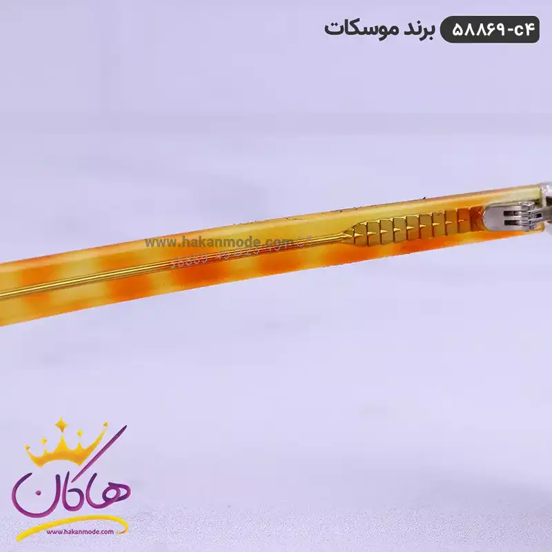 فریم این عینک که مهمترین قسمت آن است از نوع تمام فریم و از مدل گرد است. این فریم سفید شیشه ای جذاب به خوبی روی چشم قرار می گیرد. عینک آفتابی شیشه ای پلاریزه موسکات 58869 با پهنای حدود 12.1 سانتیمتر تقریبا برای تمام فرمهای صورت مناسب است اما بیشتر افرادی که صورتهای مربعی،مثلثی و بیضی دارند، از طرفداران این مدل عینک هستند. پل عینک، کائوچو و بینی گیر آن قسمتی از فریم است. عرض پل 2.3. سانت است و به خوبی روی بینی می نشیند. رنگ عدسی مشکی و عرض آن حدود 4.9 سانت است و چشم را کامل می پوشاند و در وسعت دید اشکالی به وجود نمی آورد. دسته عینک به رنگ نارنجی تیره و روشن و طول آن حدود 15.1 سانتیمتر است و با یک قوس ملایم تا پشت گوش می رود. اگر به درون دسته توجه کنید سیم کشی فلزی درون آن را می بینید که به استحکام فریم کمک می کند. سبکی این عینک کمک می کند تا ساعتهای طولانی یا هنگام رانندگی، عینک را به چشم بزنید و ابدا در قسمت گوشها یا بینی احساس سنگینی و خستگی نکنید. استفاده از این عینک محدودیت سنی و جنسی ندارد.