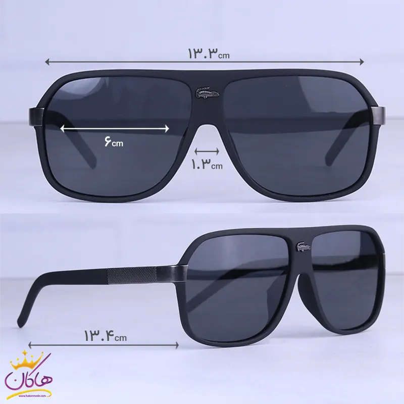 فریم این عینک که مهمترین قسمت آن است از نوع تمام فریم و به شکل مربع است. این عینک دارای فریم مشکی با طراحی اسپرت و نسبتا بزرگ است که معمولاً برای پوشش بهتر چشم و محافظت بیشتر در برابر نور خورشید طراحی میشود. در قسمت میانی بالای فریم، لوگوی لاکست (Lacoste) به شکل تمساح دیده میشود. این فریم برای افرادی که صورتهای قلبی، گرد و بیضی دارند، از طرفداران پروپاقرص این مدل عینک هستند. عرض عینک آفتابی ماتریکس مردانه حدود 13.3 سانتیمتر است. پل عینک، کائوچو و بینی گیر آن از جنس بدنهی عینک است. عرض پل 1.3 سانت است و به خوبی روی بینی مینشیند. رنگ عدسی مشکی است و عرض آن حدود 6 سانت است و چشم را کامل میپوشاند و در وسعت دید اشکالی به وجود نمیآورد. دسته عینک به رنگ مشکی و طول دسته حدود 13.4 سانتیمتر است. سبکی این عینک کمک میکند تا ساعتهای طولانی عینک را به چشم بزنید و ابدا در قسمت گوشها یا بینی احساس سنگینی و خستگی نکنید.