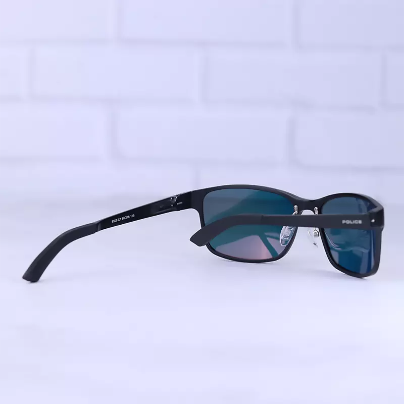فریم این عینک که مهمترین قسمت آن است از نوع تمام فریم و از مدل مستطیل است. افرادی که صورتهای گرد، قلبی و بیضی دارند، از طرفداران این مدل عینک هستند. پهنای عینک آفتابی مردانه پلیس آلومینیوم شیشه جیوهای حدود 13.8 سانتیمتر است. رنگ عدسی جیوهای قرمز و عرض آن حدود 6 سانت است و چشم را کامل میپوشاند و در وسعت دید اشکالی به وجود نمیآورد. پل عینک از جنس بدنه عینک و بینی گیر لاستیکی آن، بسیار نرم و منعطف است. عرض پل 1.8 سانت است و به خوبی روی بینی مینشیند. دسته عینک مشکی و ظریف است که در قسمت ابتدایی آن نام برند پلیس نوشته شده است. طول دسته حدود 13.5 سانتیمتر است و با یک قوس ملایم تا پشت گوش میرود. سبکی این عینک کمک میکند تا ساعتهای طولانی یا هنگام رانندگی، عینک را به چشم بزنید و ابدا در قسمت گوشها یا بینی احساس سنگینی و خستگی نکنید.