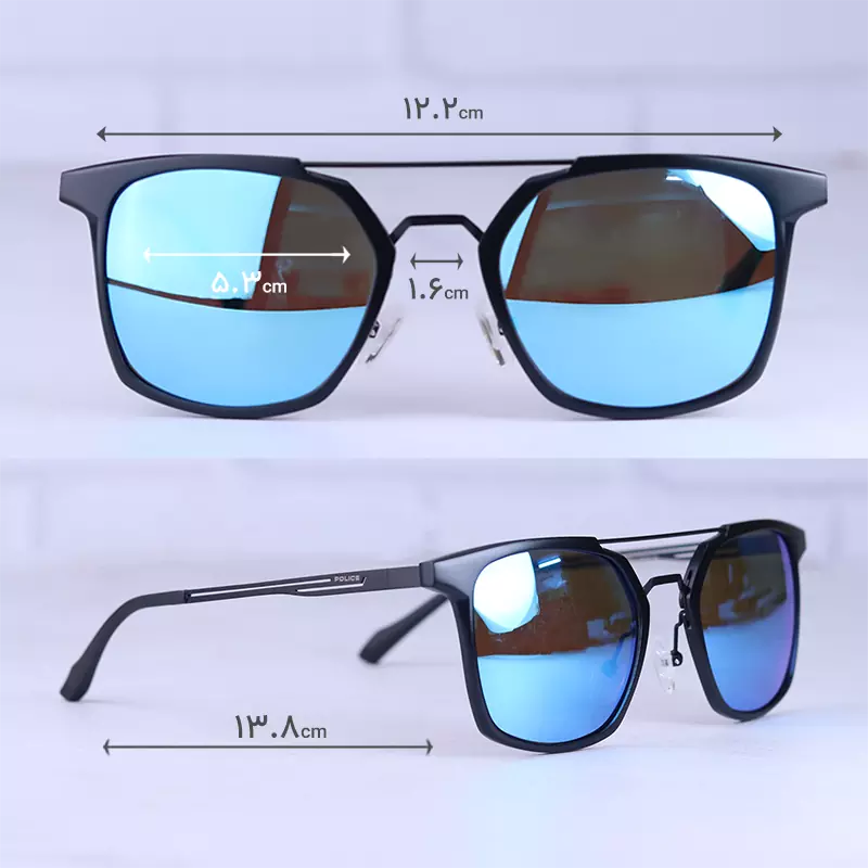 ابعاد عینک آفتابی مردانه پلیس آلومینیوم شیشه جیوه ای آبی 8639/4
