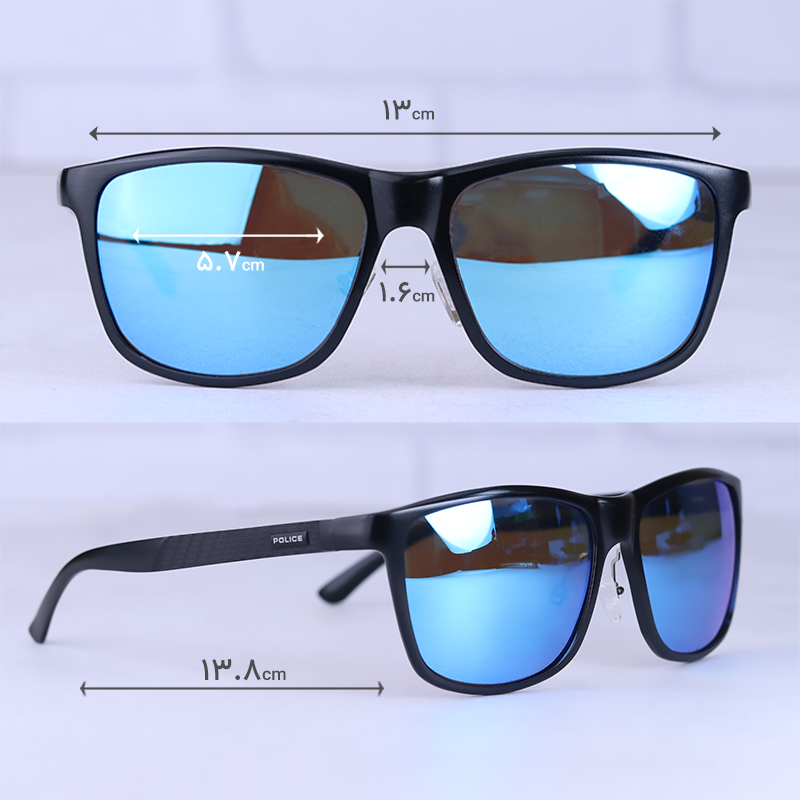 ابعاد عینک آفتابی مردانه پلیس آلومینیوم شیشه جیوه ای آبی 8587/3