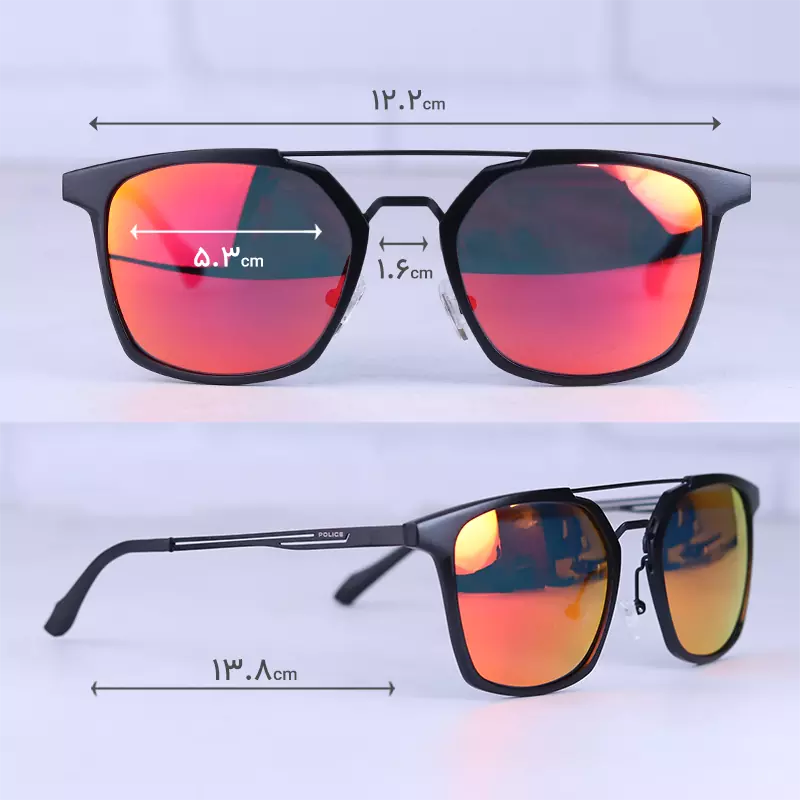 ابعاد عینک آفتابی مردانه پلیس فریم مربع شیشه جیوه ای 8639/3