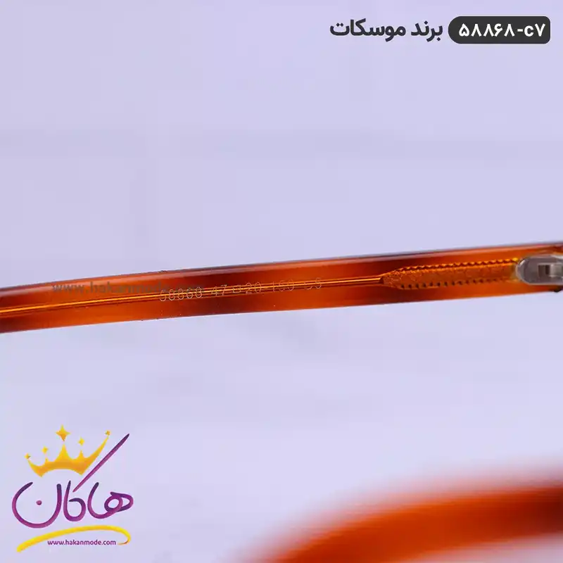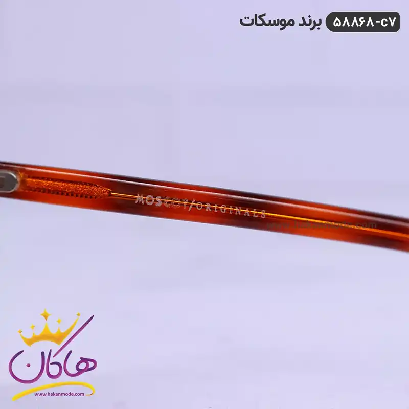 فریم این عینک که مهمترین قسمت آن است از نوع تمام فریم و از مدل گرد است.فریم دور عدسی شیشه ای و شفاف است که به خوبی روی چشم قرار می گیرد. عینک آفتابی پلاریزه موسکات شیشه ای 58868 با پهنای حدود 11.4 سانتیمتر تقریبا برای تمام فرمهای صورت مناسب است اما بیشتر افرادی که صورتهای مثلثی، مستطیل و بیضی دارند، از طرفداران این مدل عینک هستند. پل عینک، کائوچو و بینی گیر آن قسمتی از فریم است. عرض پل 2 سانت است و به خوبی روی بینی می نشیند. رنگ عدسی مشکی و عرض آن حدود 4.7 سانت است و چشم را کامل می پوشاند و در وسعت دید اشکالی به وجود نمی آورد. دسته عینک به رنگ قهوه ای تیره و روشن و طول آن حدود 15 سانتیمتر است و با یک قوس ملایم تا پشت گوش می رود. اگر به درون دسته توجه کنید سیم کشی فلزی درون آن را می بینید که به استحکام فریم کمک می کند. سبکی این عینک کمک می کند تا ساعتهای طولانی یا هنگام رانندگی، عینک را به چشم بزنید و ابدا در قسمت گوشها یا بینی احساس سنگینی و خستگی نکنید. استفاده از این عینک محدودیت سنی و جنسی ندارد.