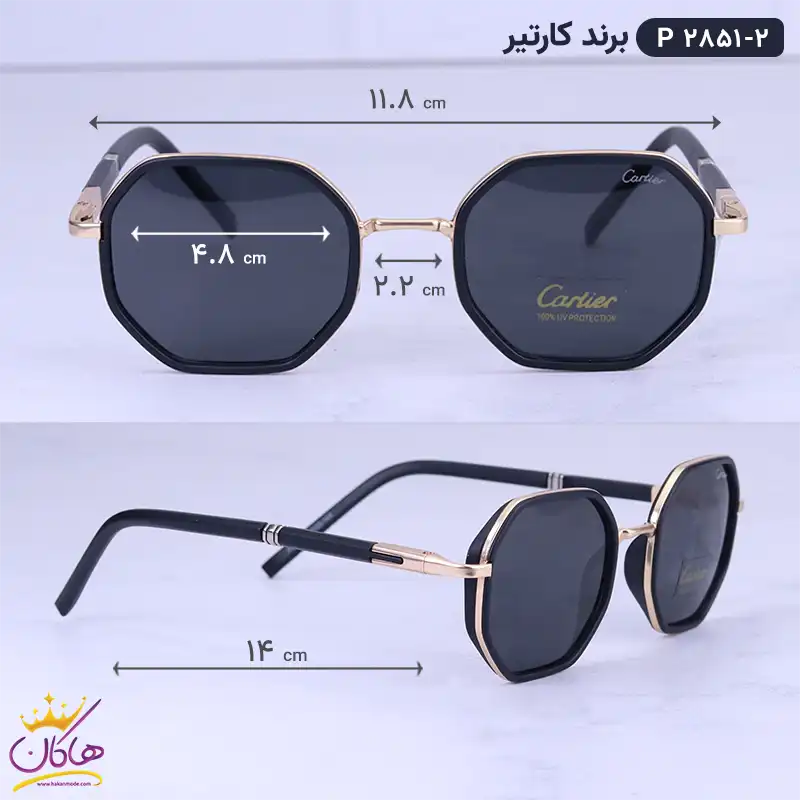 فریم این عینک که مهمترین قسمت آن است از نوع تمام فریم و به شکل چند ضلعی است. افرادی که صورت‌های مثلث، دایره و بیضی دارند، از طرفداران این مدل عینک هستند. عرض عینک آفتابی کارتیر مردانه فلز طلایی P 2851/2 حدود 11.8 سانتی‌متر است. پل عینک، فلزی و بینی گیر آن از جنس بدنه عینک است. عرض پل 2.2 سانت است و به خوبی روی بینی می‌نشیند. رنگ عدسی مشکی و عرض آن حدود 4.8 سانت است و چشم را کامل می‌پوشاند و در وسعت دید اشکالی به وجود نمی‌آورد. دسته عینک به رنگ مشکی و ظریف و شیک است. طول دسته حدود 14 سانتیمتر است. سبکی این عینک کمک می‌کند تا ساعت‌های طولانی عینک را به چشم بزنید و ابدا در قسمت گوش‌ها یا بینی احساس سنگینی و خستگی نکنید.