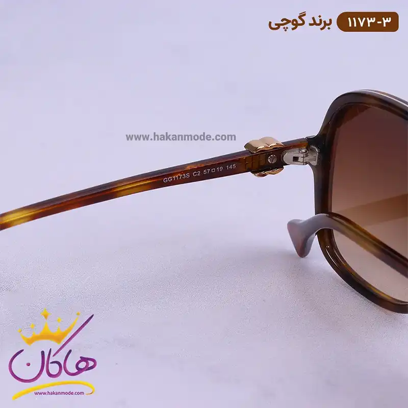 فریم این عینک که مهمترین قسمت آن است از نوع تمام فریم و به شکل مربعی است. این فریم پلنگی به خوبی روی چشم قرار می گیرد. پهنای عینک آفتابی گوچی زنانه 1173/3 حدود 13.3سانتیمتر است. افرادی که صورتهای مثلثی، گرد و بیضی دارند، از طرفداران این مدل عینک هستند. پل عینک، کائوچو و بینی گیر آن از جنس بدنه عینک است. رنگ عدسی قهوهای و عرض آن حدود 5.7 سانت است و چشم را کامل میپوشاند و در وسعت دید اشکالی به وجود نمیآورد. عرض پل 1.9 سانت است و به خوبی روی بینی مینشیند. دسته عینک پلنگی است که در قسمت ابتدایی آن لوگوی برند گوچی طراحی شده است. اگر به درون دسته توجه کنید سیم کشی فلزی درون آن را میبینید که به استحکام فریم کمک میکند. طول دسته حدود ۱۴.۵ سانتیمتر است و با یک قوس ملایم تا پشت گوش میرود. سبکی این عینک کمک میکند تا ساعتهای طولانی یا هنگام رانندگی، عینک را به چشم بزنید و ابدا در قسمت گوشها یا بینی احساس سنگینی و خستگی نکنید.